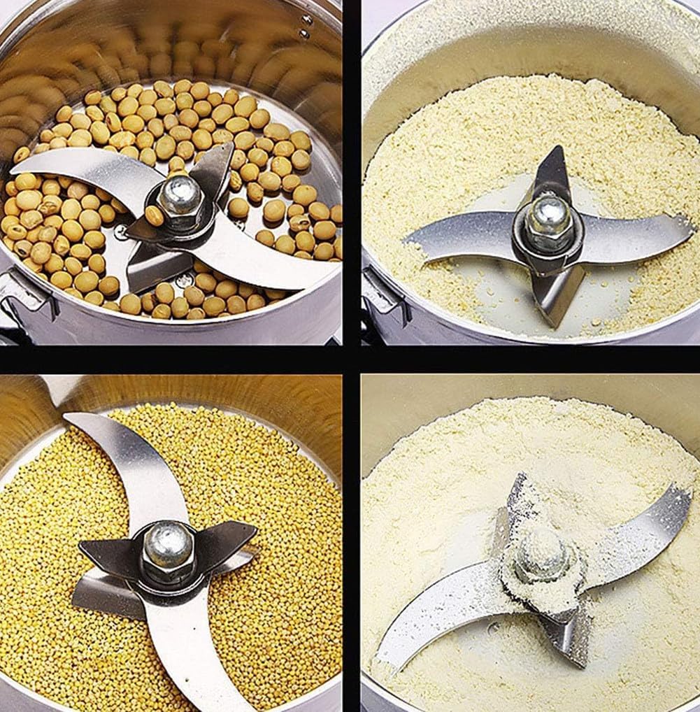 High-speed multi-function grinder brings convenience and health to your life Beautiful and exquisite: The grain crusher is exquisite in design, small in size, high in efficiency and easy to carry. Very efficient and easy to operate. Name: Spice/ /Coffee/Rice/Corn/Bean Grinder The electric grain grinder can grind any hard objects to ensure that the material can be pulverized within 5 minutes. It's efficient and saves time. It can make all kinds of powders from ingredients, for household, food,, restaurants, cafes, laboratories, processing plants. Grinding machine features and parameters: 1. Large capacity design: 1500g,2000g,3000g,3500g,4500g 2. Fast grinding speed: 3-layer martensitic steel knife 3. Food grade safety: 304 stainless steel material, mainly used for making tableware, anti-corrosion, easy to clean 4. Swivel design: more uniform grinding.270° manual swing, easy to operate 5. Durable: Air overload protection, the machine is overheated or the load is too large, the power is automatically cut off 6. High quality: commercial copper electric motor, the motor copper wire is thicker, the power is large and the speed is fast Crushing time: 5-8 minutes Interval time: 8-10 minutes Grinding degree: fine grinder Size: 15*15*33m Weight: 12kg Package contents: grain grinder × 1 Note: Wet, water-containing, fresh, soft and hard materials cannot be grinded (such as fresh meat, fruits, vegetables, etc.) Rated voltage (appliances or chargers): AC110-240/50HZ;