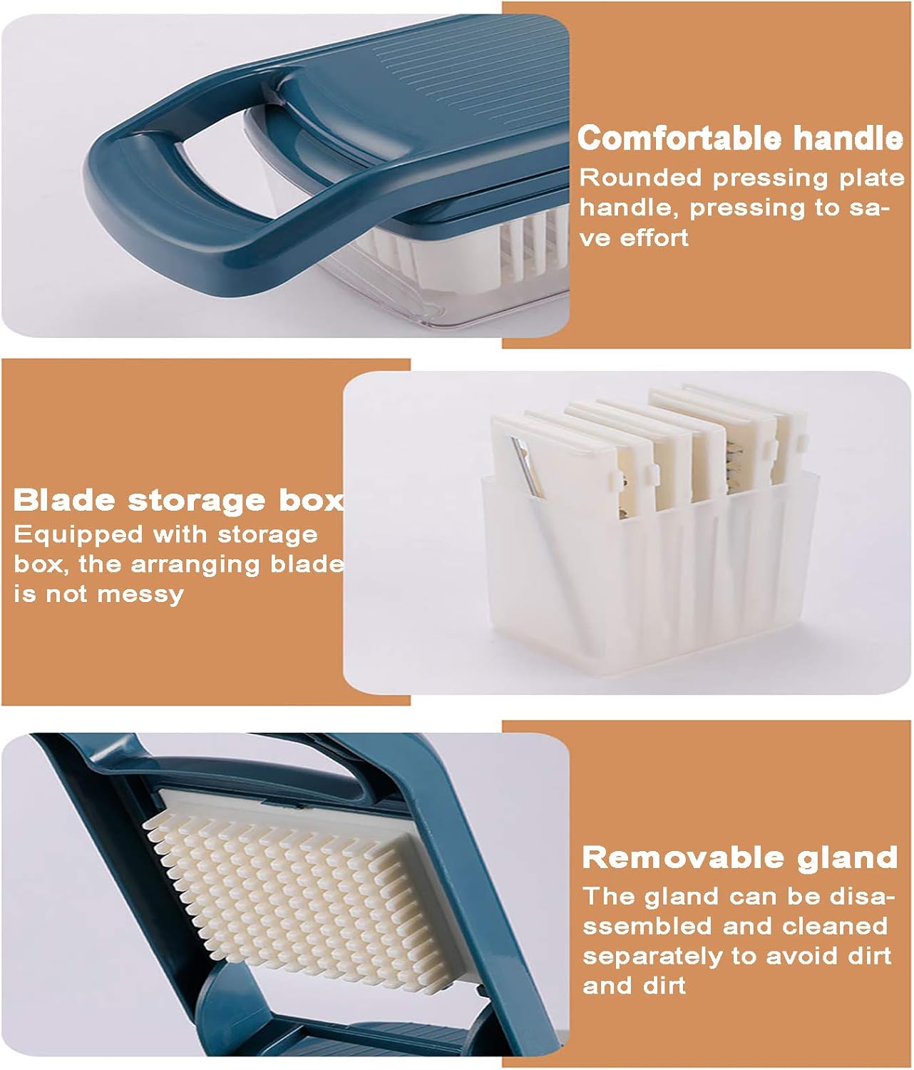Convenient Cooking Life Start From Using Vegetable Chopper.Food Cutter Is Your Good Helper In Kitchen. Multiple Blades 9 Blades For Your Choice,Make The Fruit And Veggie Chop New Tricks.Make Your Taste Buds Move And Dance. Super Quality And safety From Product Materials To Finished Product Quality,Bpa-free,Food Grade Hardened Abs Plastic And Stainless Steel,Ensure That You Can Use Our Product Confidently. Compact And Large capacity Compact Appearance For Sparing Space,Containing Much Food. Easy To Clean After Cutting Vegetables And Fruits,It Is Recommended That You Clean The Knives With Tap Water.Please Take Care When Clean The Blades. NOTE: - When Shredding Food,Be Sure To Use A Hand Guard To Fix It. - For Hard Skin Vegetables/Fruits,Peel Off It First. - Do Not Let It Immerse In Water For A Long Time,Please Cut It In Clean Food. Package List: 1*Vegetable Cutter 9*Blade 1*Clean Brush if You Have Any Questions About This Chopper,Please Feel Free To Contact Us.