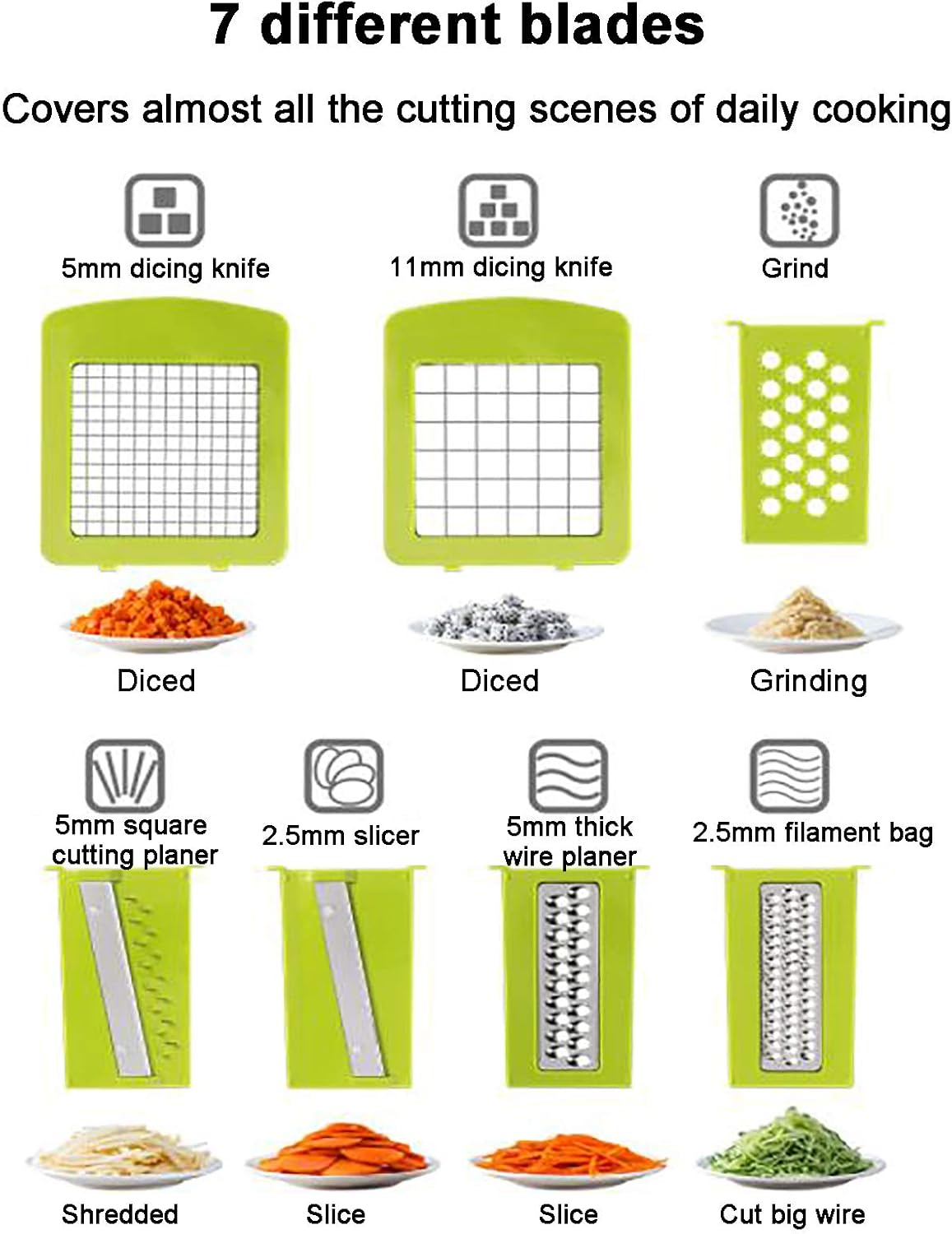 Convenient Cooking Life Start From Using Vegetable Chopper.Food Cutter Is Your Good Helper In Kitchen. multiple Blades 7 Blades For Your Choice,Make The Fruit And Veggie Chop New Tricks.Make Your Taste Buds Move And Dance. Super Quality And safety From Product Materials To Finished Product Quality,Bpa-free, Food Grade Hardened Abs Plastic And Stainless Steel,Ensure That You Can Use Our Product Confidently. Compact And Large capacity Compact Appearance For Sparing Space, Containing Much Food. Easy To Clean After Cutting Vegetables And Fruits,It Is Recommended That You Clean The Knives With Tap Water.Please Take Care When Clean The Blades. NOTE: - When Shredding Food,Be Sure To Use A Hand Guard To Fix It. - For Hard Skin Vegetables/Fruits,Peel Off It First. - Do Not Let It Immerse In Water For A Long Time,Please Cut It In Clean Food. Package List: 1*Vegetable Cutter 7*Blade 1*Handguard 1*Drain Basket 1*Clean Brush If You Have Any Questions About This Chopper,Please Feel Free To Contact Us.