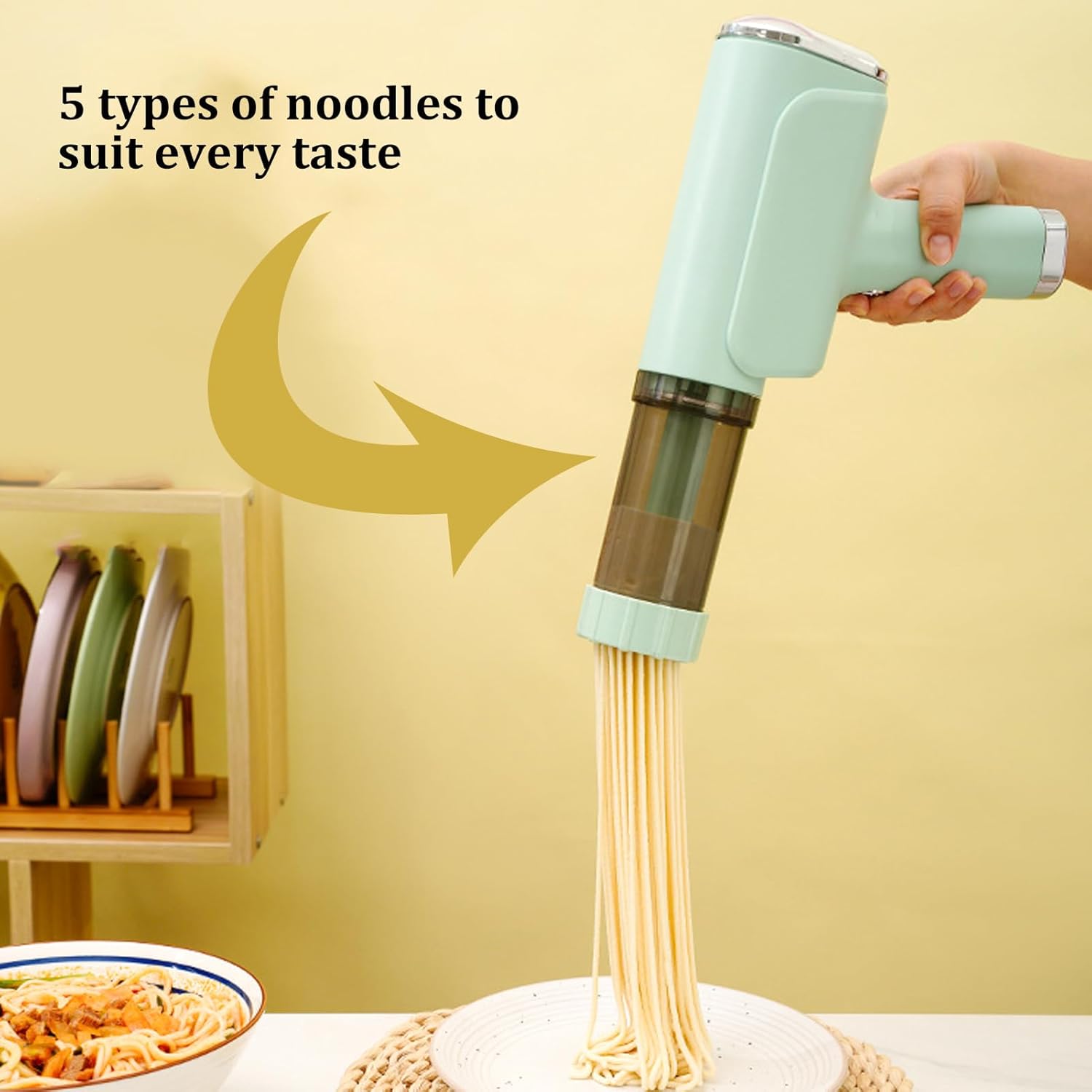 Product Features :1.Stuff the dough(not included) into the pasta press barrel;2.Attach the pasta press barrel and tighten it;3.Press the start button;4.Begin extruding noodles.Color: Green,WhiteOperation Mode: AutomaticProduct Material: Stainless Steel + PcPower Source: Battery PoweredCharging Time: About 4HPackage: Scraper, Measuring Cup, Charging Cable, 5 MoldsNotes:1.Please note that this product does not include items such as flour.2.Please allow the slight color difference caused by the shooting light and 1-3cm error due to manual measurement, and make sure you do not mind before you order.