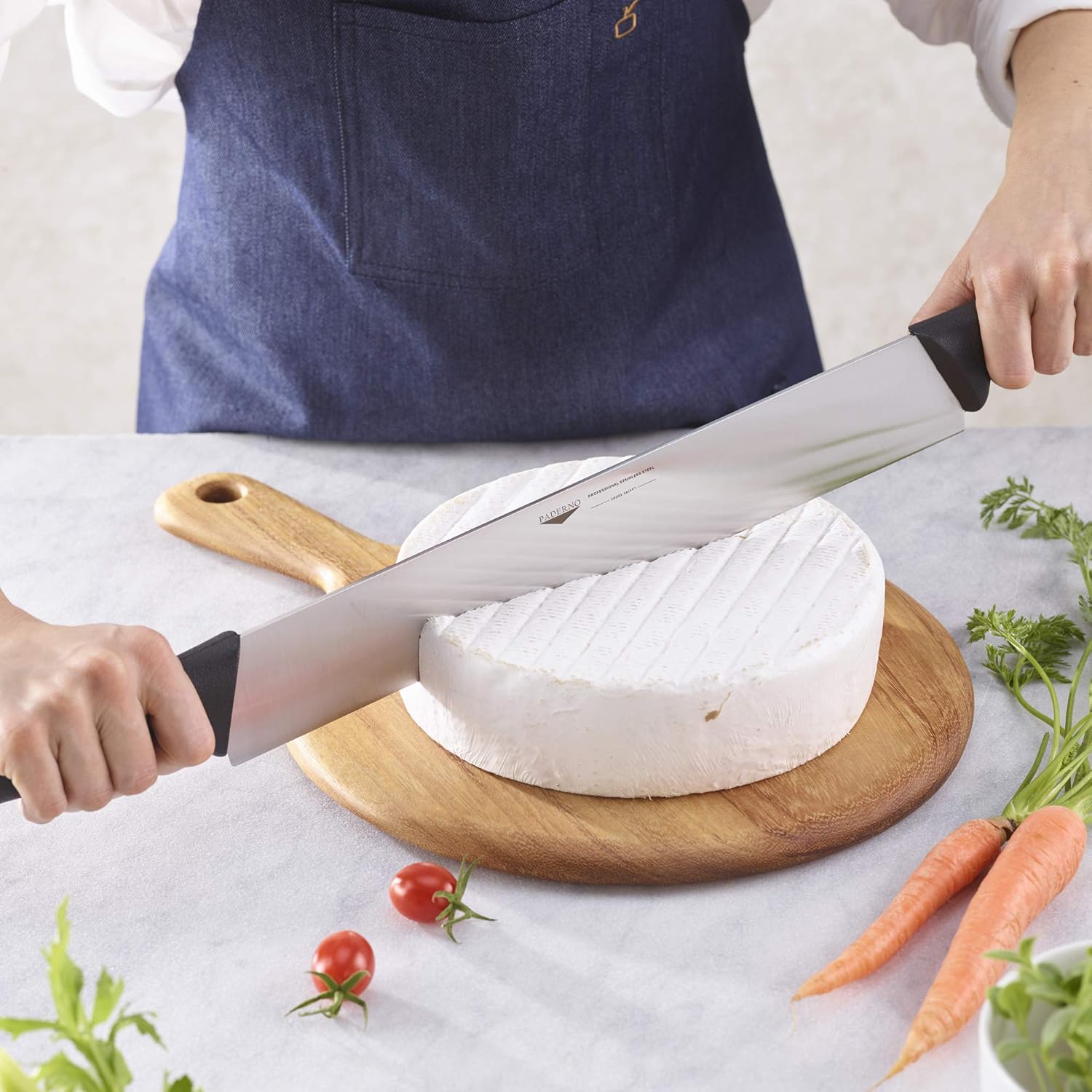 The Paderno World Cuisine 14 1/8 inch two handled cheese knife has a forged blade constructed of a special steel and carbon alloy which insures a perfect cut and extends the life of the blade. The knife handles are resistant, non-slip, made of an inert plastic material, and composed of stainless steel inserts.