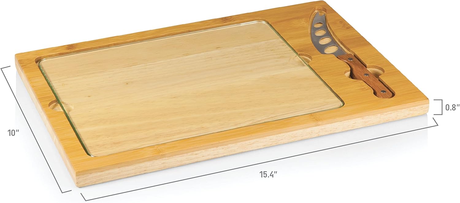 | Included Components | 1 Base, (Parawood, Bamboo, 15-3/16"L X 10"W X 0.75"H), 1 Brushed Stainless Steel Knife, (Bamboo Handle, 4.625"L Blade That Is 0.55" Thick), 1 Tray, (Tempered Glass, 11"L X 8.5"W X 5mmThick) |