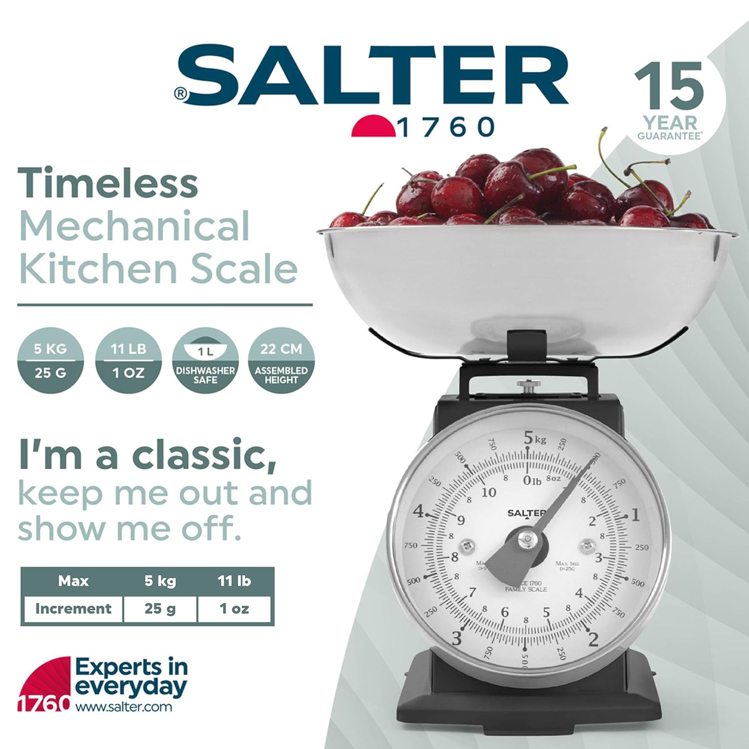 | Item Type Name | Salter SA00562BFEU12 Timeless Mechanical Kitchen Scale – 5kg Capacity, 1 Litre Dishwasher Safe Bowl, Measures Grams/Oz., Baking Scale, Classic Design, Easy Read Large Digit Dial, 22cm Height, Black |