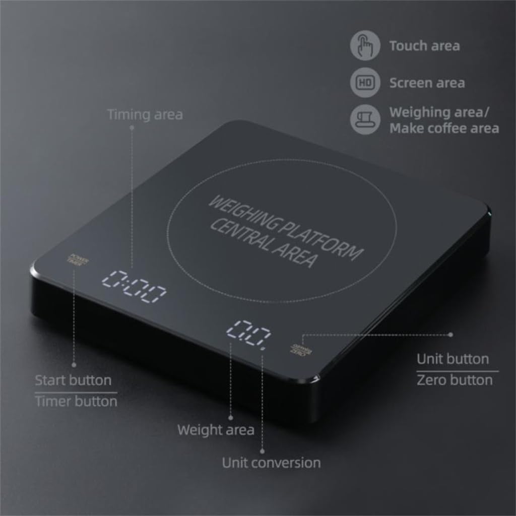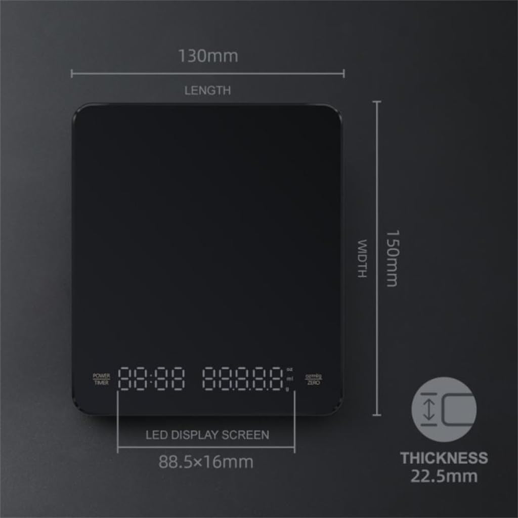 Weighing range: 0.1 ~ 3000gDivision value: 0.1gWindow size: 89x16mm/3.5*0.6in LED displayPower supply: Type-C interface chargingProduct size: 150x130x22.5 mm/5.9x5.1x 0.87inKey function: long press to start, peel and return to zero, automatic shutdown, extended timing 99m: 59SUnit conversion: (g / oz / ml)Size: 140x184x33mm/5.5x7.2x1.3inAll-in- electronic scale for hand-brewed coffee with timing function, daily weighing and other all-in- electronic scales.simple atmosphere, high-end quality life, high precision.Digital screen display, clearer reading, with four-speed unit changeover switch (g/oz/ml)The longest time: 99 minutes and 59 seconds (left button) Suitable for hand-brewed coffee weighing, the maximum load is 3kgStable quality, more accurate weighing,up to 0.1gThe scale surface material is resistant to high temperature of 135 degrees.Package Include:1xCoffee ScaleWide Applications: Suitable for weighing all kinds of small items like coffee beans, coins, gems, various powders, pills, and reloading.Perfect for use as Jewelry scale, coin scale, gold scale and food scale in kitchen.