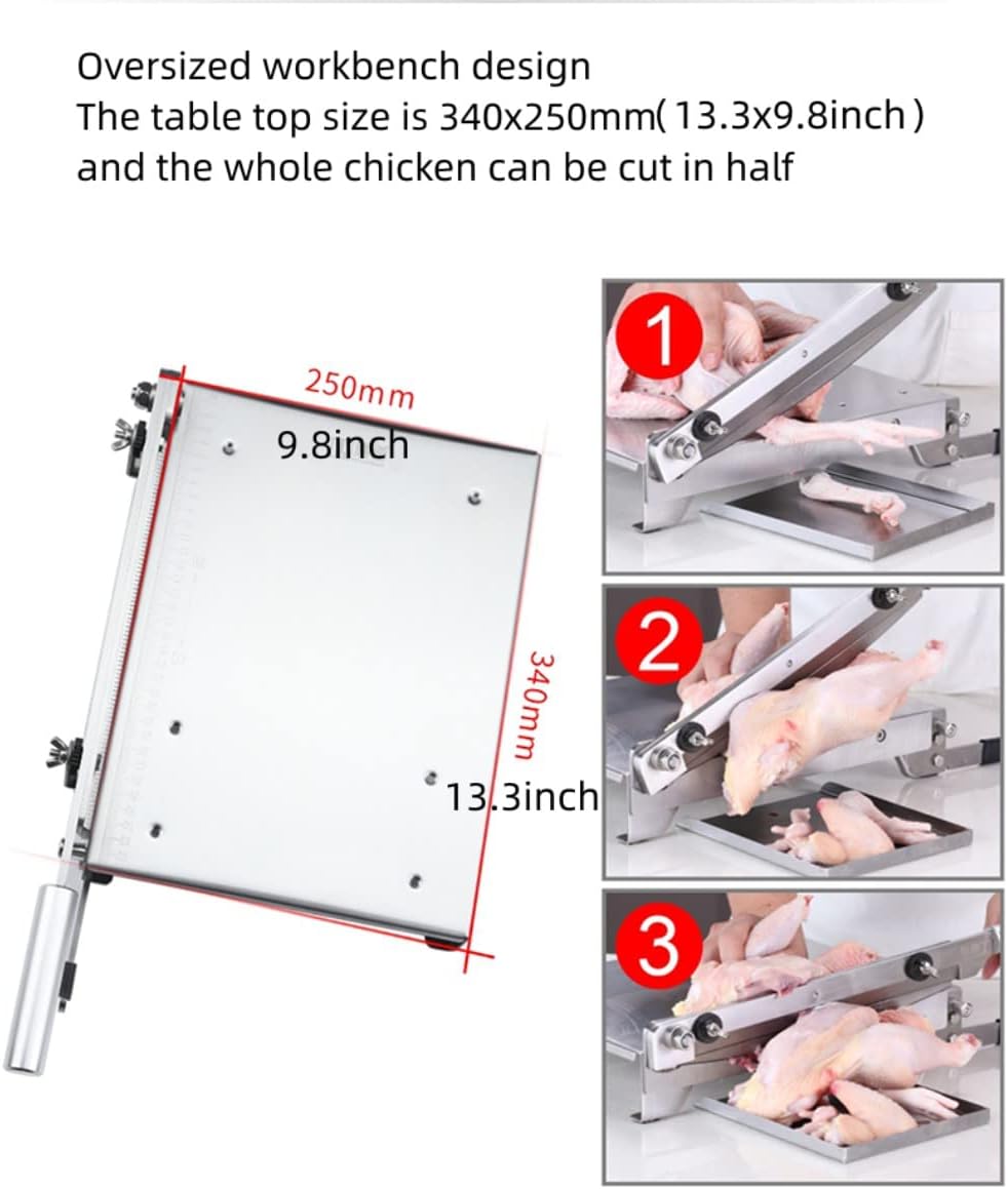 Specifications: Name: Manual Meat Cutter Color: Silver Material: Stainless steel Blade:4mm thick Alloy steel Handle: Aluminum Alloy blade length: 240mm/9.5inch blade Thickness: 4mm operation mode: Manual shipping weight 4kg Suitable for cutting pork ribs,beef, mutton,chicken feet, fish, cake, herb, etc. Features: ● Special stainless steel blade, in use. ● Stainless steel construction, solid and durable. ● Easy to clean and enable for a long time to use. ● Easily slices meats, hard vegetables and fruit. ● The meat slicer can solve most of your meat roll problem. Operate Tips: Step 1: Put the machine on table, make the suckers stable immobilized, and load the meat into the meat shelf. Step 2: Hold the handle to cutting the meat slowly. Warm Reminder: * Please keep clean after using every time to avoid rusting issues. * The stainless steel slicer can only cut meat, hard vegetables and fruit. * Do not put it 100% fresh meat on it, it can’t work with them. Introduction 1. Ensure that the machine is placed on a flat and stable workbench for operation. 2. Use a soft cleaning cloth for cleaning. After rinsing it, wipe it dry and place it in a cool and dry place. 3. When not in use for a long time, apply anti-rust oil to stainless steel parts (use vegetable oil instead). Matters Needing Attention 1. Do not touch the blade with your hands to test its sharpness. 2. Do not use hard cleaning tools to clean it to avoid scratching the surface. 3. After cleaning, please wipe dry and store in a cool and dry place. 4. Please place it in a place out of reach of children. Package Included: 1X Meat Slicer ,Screw Accessories