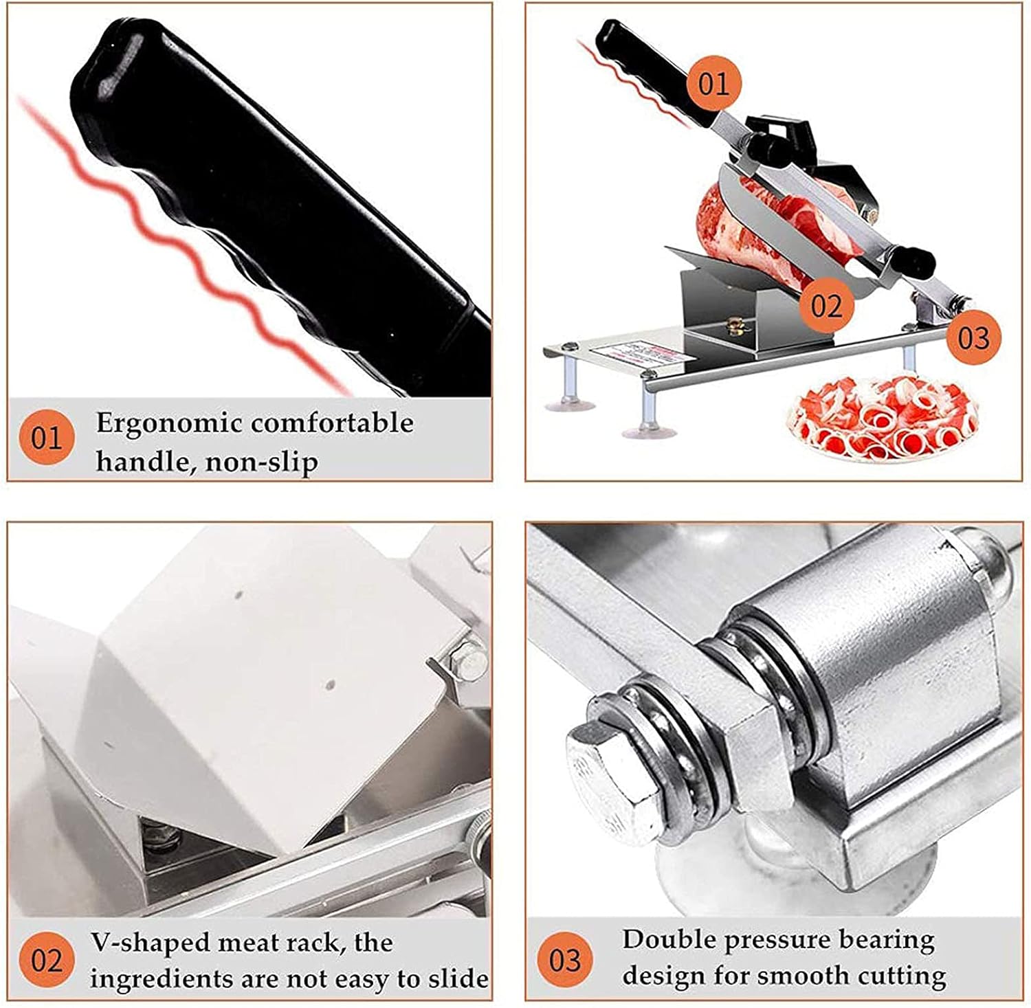 ★Features:FROZEN MEAT SLICER has a slice thickness uniformity, and rolling effect, easy operation and other notable featuresSlice thickness can be adjusted from 0.5 to 8 mm, high efficiency meatQuickly cut ingredients, not only meat, but also hard vegetables, such as potatoes, cucumbers, carrots, etc.The use of alloy steel blades, high speed steel blade durable than 2-3 timesAffordable, suitable for restaurants, hot pot restaurants use, but also an indispensable tool for the home kitchen supplies★Optimization:Pressing meat functionThe cover is used to pressing the meat, avoid the meat slippingSuckerHigh quality sucker prevent machine sliding★Specification:Blade material: thickening and high quality alloy steelFuselage material: stainless steelRotation method: knob fast adjustmentCleaning method: water washingSize:270*140*50mmWeight: 2130g
