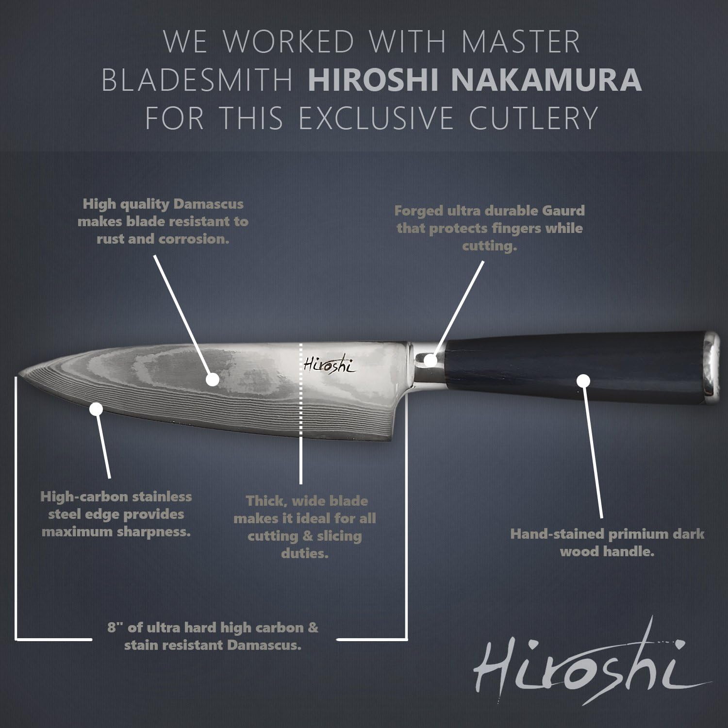 The HIROSHI 8 InchChef Knife is crafted with a high carbon steel knife, delivering lasting sharpness and durability for all your kitchen tasks. Its precise kiritsuke knife design ensures effortless slicing, dicing, and chopping, making it perfect for home cooks and professional chefs alike.Featuring a damascus kitchen knifelayered blade, this knife combines strength with a sharp, long-lasting edge. The ergonomic handle provides comfort during extended cooking sessions, reducing hand fatigue and improving control.Versatile and practical, it also works as a japanese paring knife or utility kitchen knife for fine prep work. Packaged in an elegant gift box, this professional knifeis a high quality chef knifethat makes an ideal gift for culinary enthusiasts.