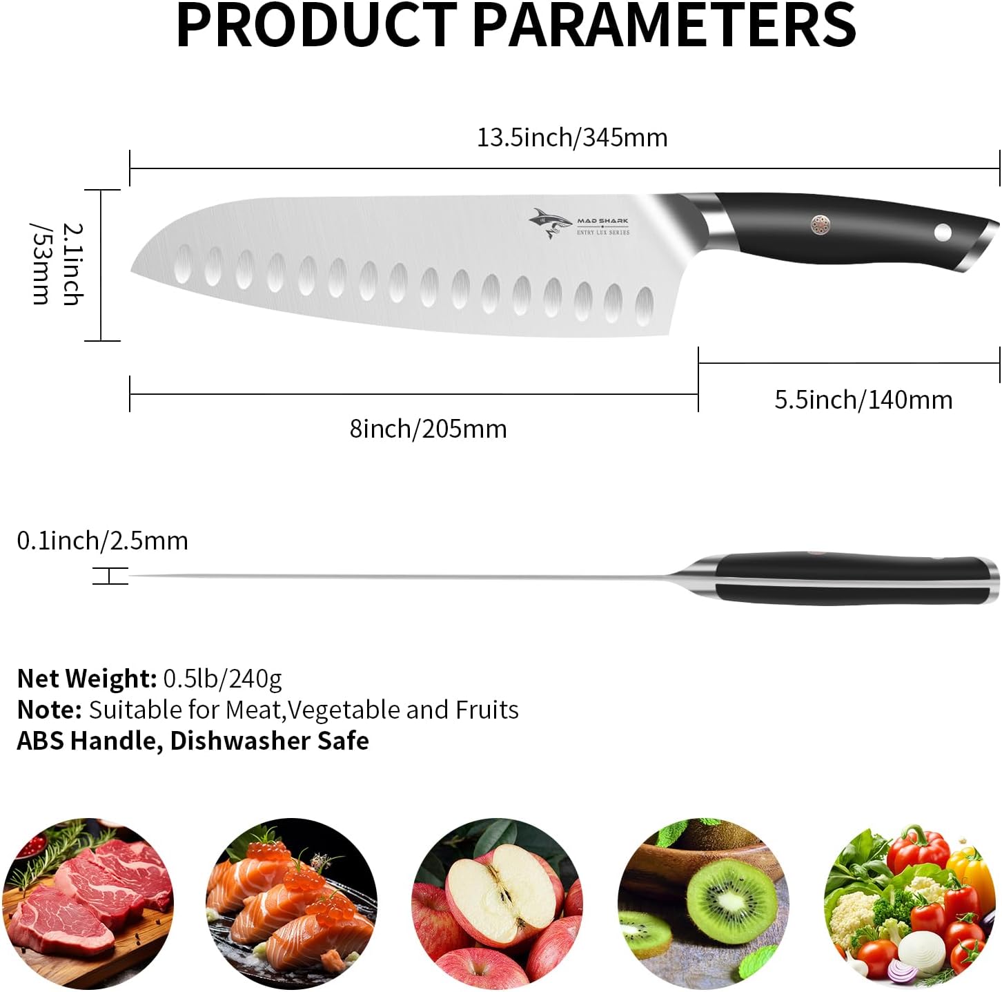 MAD SHARK knives are made of high-quality German stainless steel, discoloration. The razor-sharp edge is easy to maintain and makes cutting or chopping a breeze.Each handle is engineered to gently widen where it meets the blade to help protect fingers. Each knife from MAD SHARK has gone through the extremely strict detection before it comes to your end. No defect is allowed from the very begining process. Limited Life-Time Support if there is any problems during usage. CARE AND USE: Watch out for the sharp cutter edge and eliminate direct hand touch. Clean the knife with soapy cloth after every use and keep it dry and safe. Wooden handle, no dishwasher, no soaking for a long time, try to keep dry. Hone the knife with honing steel every 2-3 month to maintain its sharpness.