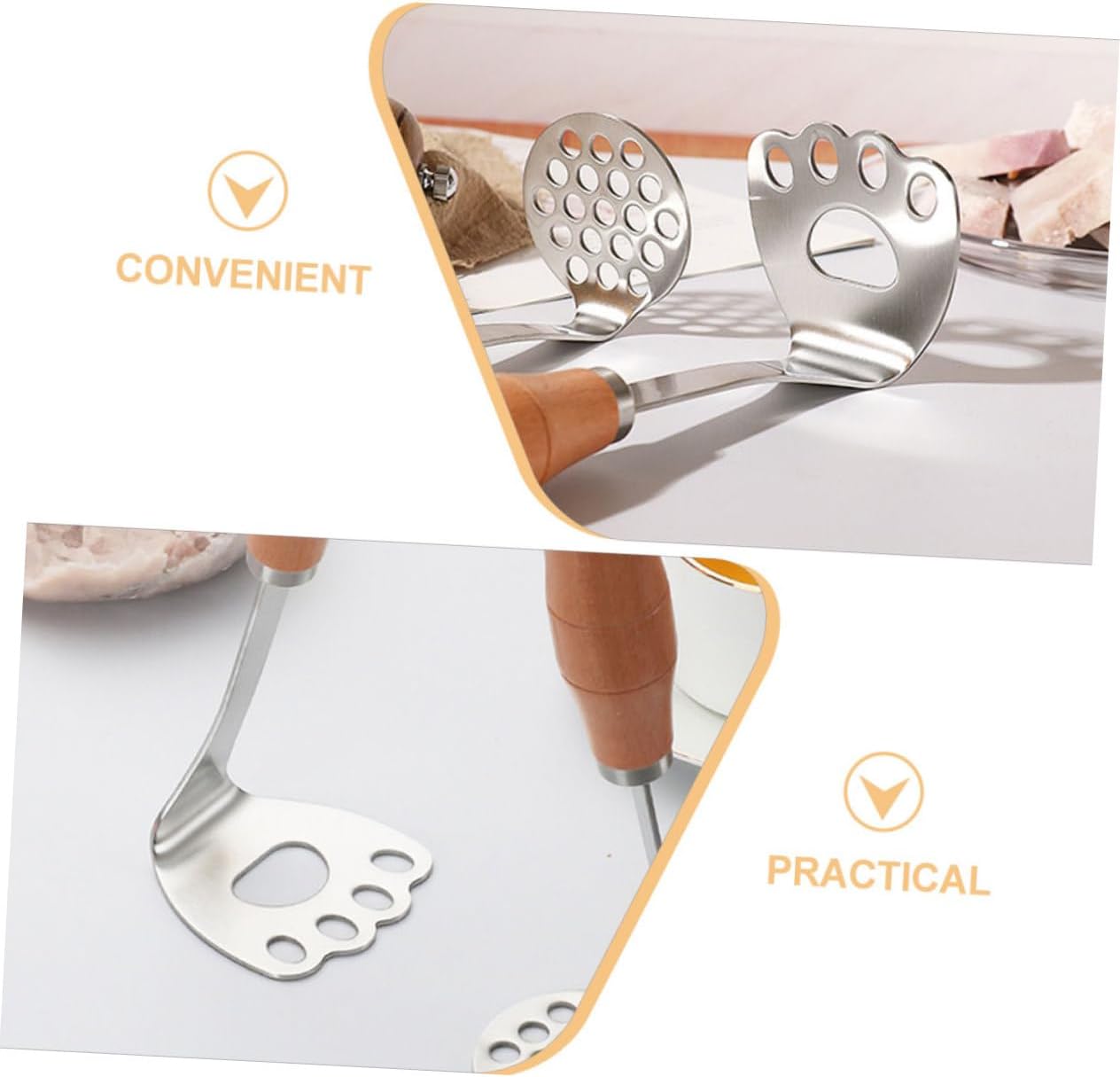 Package List 4 x potato masher Features -Material:Stainless steel, wooden masher for potato - Size: 21.50X7.00X7.00cm/8.45X2.75X2.75in tools -Color:As Shown mashed potato - Effortless operation, this potato masher is very easy to use, saving you time and energy Easy to clean potatoes masher tool. - Potato Crusher is suitable for making fruit puree and vegetable puree, such as pumpkin, carrot, potato mash. - Simple design, potato masher is practical and smooth in lines Comfortable grip, make it easy to operate mash potatoes masher. -Made of 304 stainless steel for performance Versatile design allows for mashing potatoes mini. - Potato Crusher well-made of sturdy materials, safe and practical for using time, widely used. electricGoods Descriptionfood pressing tool You can use potato masher to make truly delicious meals for you and your family.wooden handle potato masher Potato Masher is making pumpkin, carrot, potato and other fruit puree and vegetable puree.reusable potato masher The wooden handle of this potato masher is comfortable to grip, moderate friction and stable operation