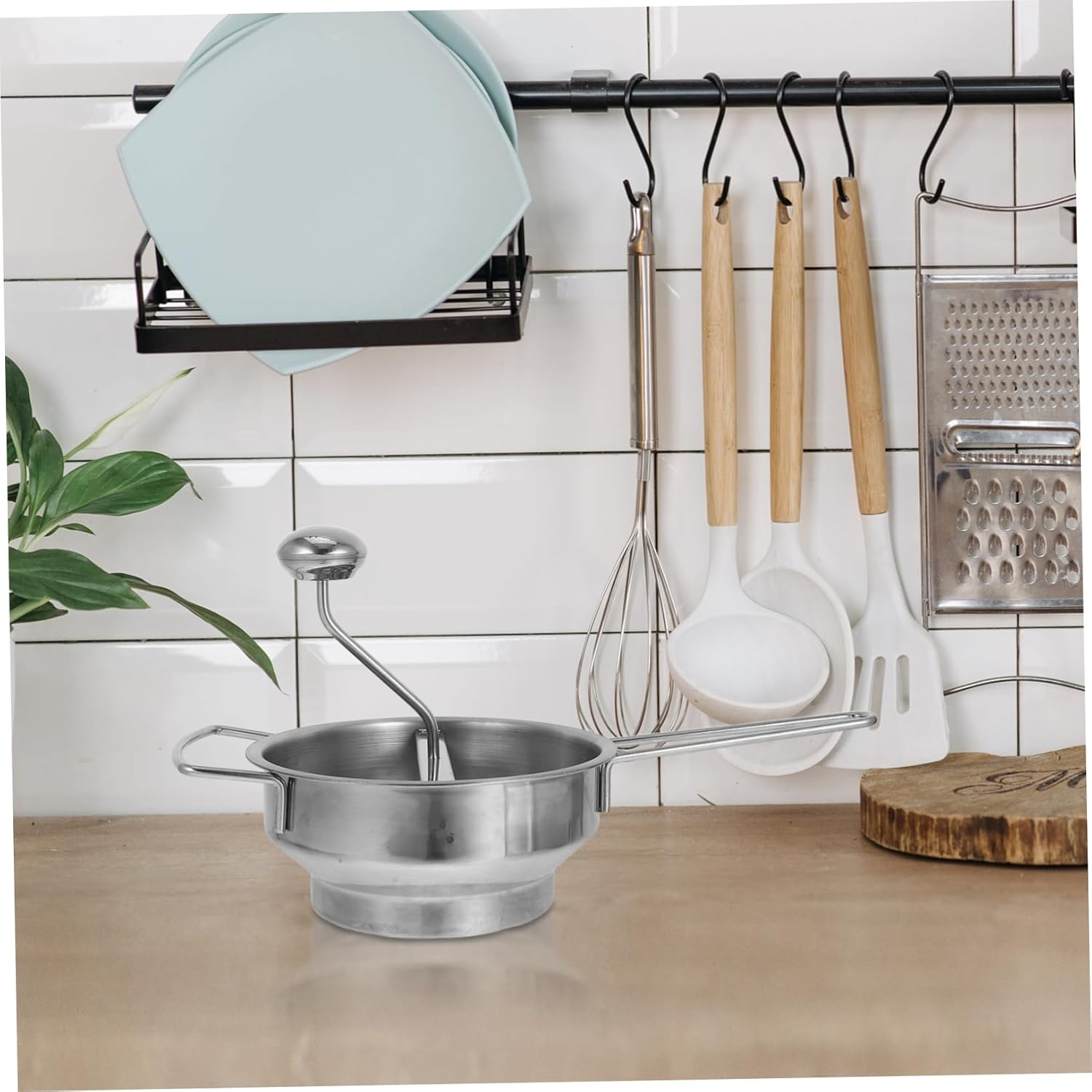 Package Include 1 x Rotary Potato Ricer 1 x Grinding Disc(2mm hole) 1 x Grinding Disc(3mm hole) 1 x Grinding Disc(7mm hole) Features - Safe and convenient to use: not easy to break or deform, reusable and can be applied for longtime kitchen ricer tool -Material:Stainless steel potato ricer masher. -Multipurpose: suitable for mashing potatoes, crushing fruits and vegetables, making it versatile kitchen tool potatoes masher -Compact size: its small and portable size makes it easy to store and carry, ideal for use or on the go food masher tool -Effortless operation: designed for ease of use, it allows for quick and efficient food preparation rotary potato ricer with handle -Size:13.50X13.50X0.50cm/5.31X5.31X0.20in stainless steel potato ricer -Color:Silver potato ricer stainless steel -Size:40.50X21.00X9.00cm/15.92X8.25X3.54in mashed potato masher stainless steel -Ergonomic handle: the ergonomic handle provides comfortable grip, reducing hand strain during use manual food ricerGoods Descriptionmetal potato masher The stainless steel construction ensuring it sturdy enough and easy to clean.manual food ricer Its compact size makes it easy to store.ergonomic food mill This manual food ricer not just for potatoes; it can also be used to mashing a variety of vegetables and fruits