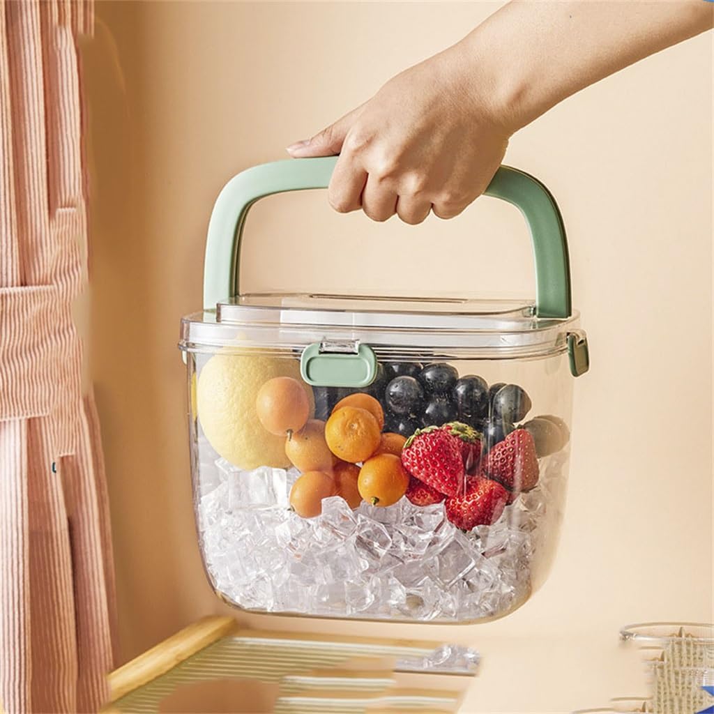 Sealed ice bucket with carrying handle.Migui top cover, the top cover is equipped with a silicone , put into the refrigerator without stringing flavor.Beautiful and practical, easy to carry.Hundreds of changing scenes . Easy to cope with.Enhance the sense of happiness, goodies.Product Category: Ice bucketMaterial: silicone + PET + PPSize: 21.5*14.5cmPackage include:1 * ice bucketAttention:1.Please allow 2-3cm error when measuring.2. Due to the different computer screens, the color of the real thing may be slightly different from the above picture, please understand the inconvenience.Holds fried chicken,snacks,kantochi,ice cubes etc.