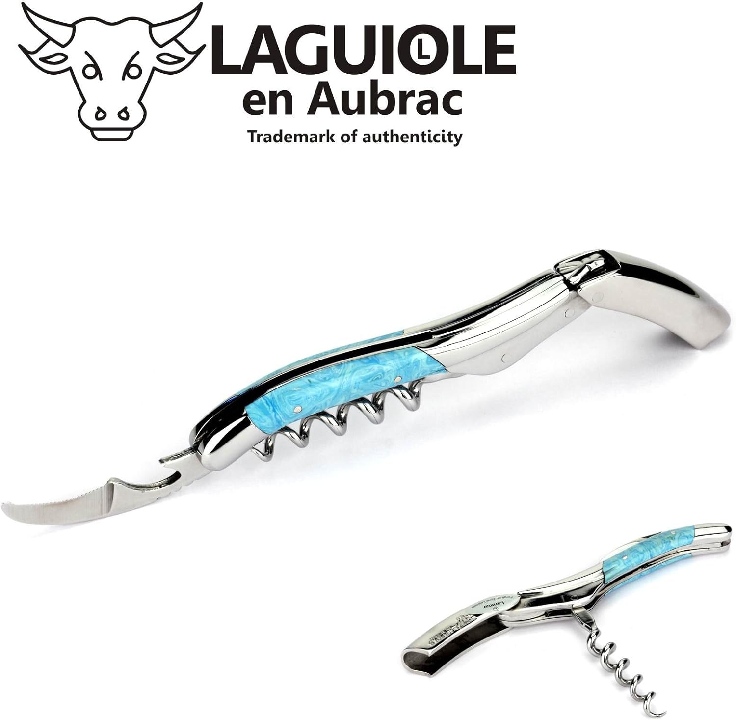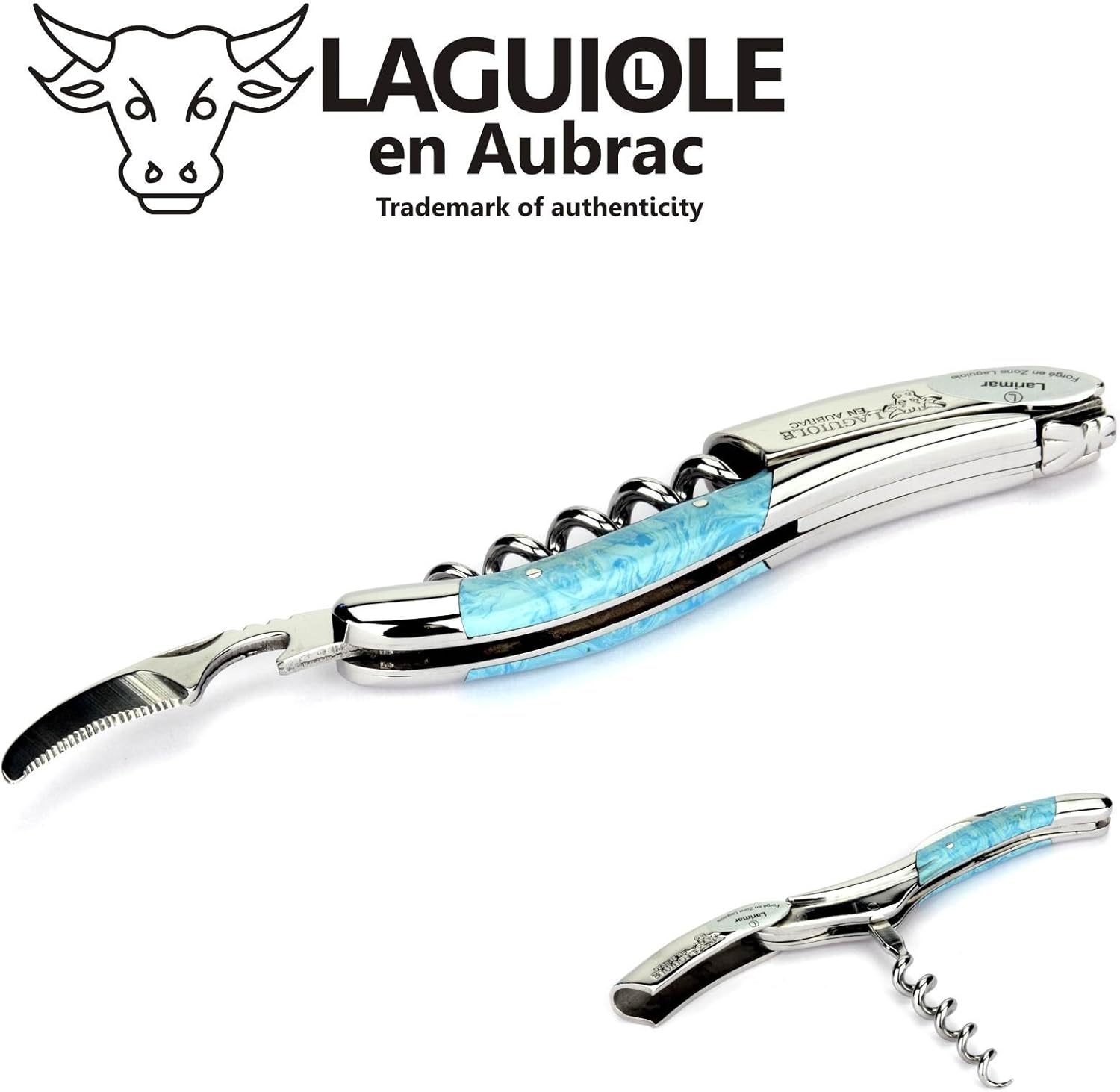 Genuine Laguiole waiters knife. Finest traditional handcraft made in France by Laguiole en Aubrac.Delivered with a certificate of authenticity.Item Code: SOM99PWIGenuine Laguiole sommelier - 119 g3 functions: foil cutter - corkscrew - bottle openerStainless steel shinyLarimar handle Including:waiters knifelinen baggift boxdescriptioncertificate of authenticity Every step in production has been done by only one cutler. He guarantees for the quality by chiselling his personal sign into the foil cutters back.