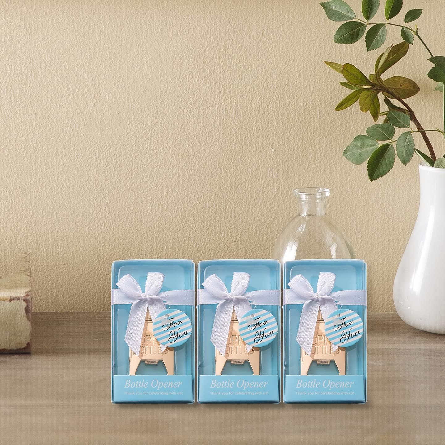 Package Include:24 pcs beer bottle openers for party favor/gift 100%Brand New and High Quality: Made of metal alloy, every bottle opener is well made, durable,unique, and beautiful, they will definitely surprise your friends and guests, everyone will love them so much. Great for baby shower party favors,give aways for baby shower,weddings souvenir gift ,birthdays decoration or any other celebration. Details : Baby shower party gift presentation includes light Blue base with clear cover, white rope tie and bow, and round,coordinated hang "for you"tag.No DIY requied! Material:Zinc alloy Color:Golden Gift Box Color:Blue Shape: Baby's Bottle Bottle opener size:3.0*1.4 inches Party favor gift box size:4.7*2.5*1 inch Our bottle opener with cute gift packaging.Can be used as: Baby shower favors Baby shower table decorations Birthday party favors Wddding party favors for guests Bridal shower favors Retirement party favors Wedding party decoration Gender reveal party favors Gender reveal party decoraton And it's also a great gift to your business clients. These unique bottle openers are sure to be a hit with guests and a favor favorite. If you want to see more interesting styling designs, you can open my store, It will bring you more surprises.