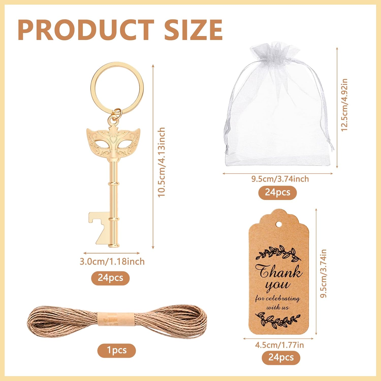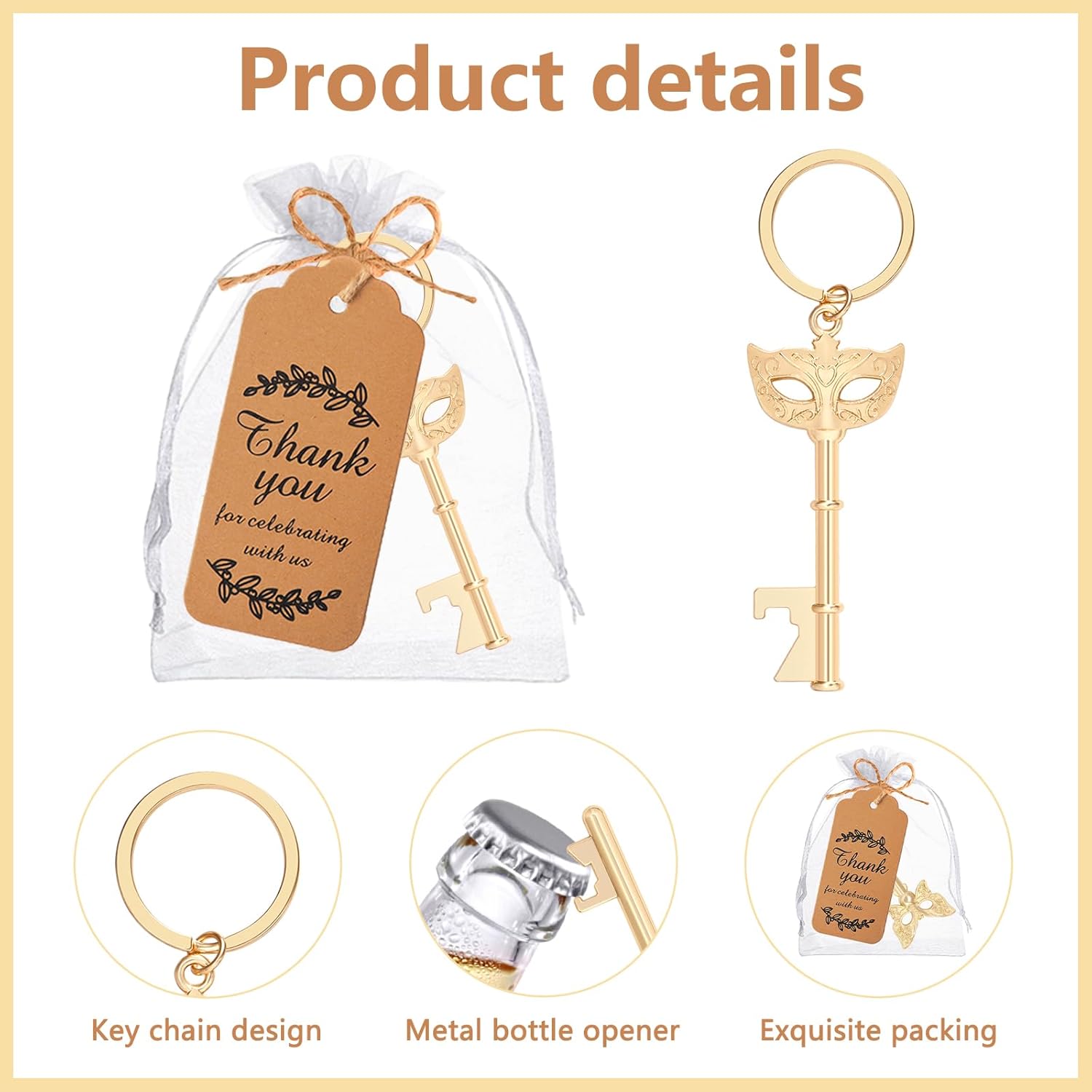 Product Features: Introducing our Mask Design Keychain Bottle Openers, the perfect accessory for any celebration or event. Whether you're hosting a masquerade party, wedding, or simply need a convenient bottle opener on-the-go, these keychain bottle openers are just what you need. These multi-functional bottle openers serve as both practical tools and stylish decorations. Crafted with a unique mask design, they add an elegant touch to your party decor and make for eye-catching centerpiece table decorations. The gold finish of the centerpieces adds a touch of sophistication, making them ideal for upscale events like masquerade balls or speakeasy parties. In addition to being beautiful party decorations, our Mask Design Keychain Bottle Openers also double up as thoughtful thank-you favors for guests. Your friends, family, or wedding attendees will appreciate receiving a functional gift that can be used long after the event is over. These wedding favors for guests are not only practical but also serve as a reminder of the joyous occasion they celebrated with you. Whether you're looking to organize a trunk or treat event, plan a masquerade party, or add a touch of elegance to your wedding reception, our Mask Design Keychain Bottle Openers are the perfect choice. Versatile and stylish, they are sure to impress your guests and make your event memorable. So why wait? Get your hands on these unique design masks and let the celebrations begin! Specification: Product size: as shown in the picture Product material: zinc alloy Product colour: gold Product weight: 20g Product List: 50 PCS X Mask Design Keychain Bottle Openers