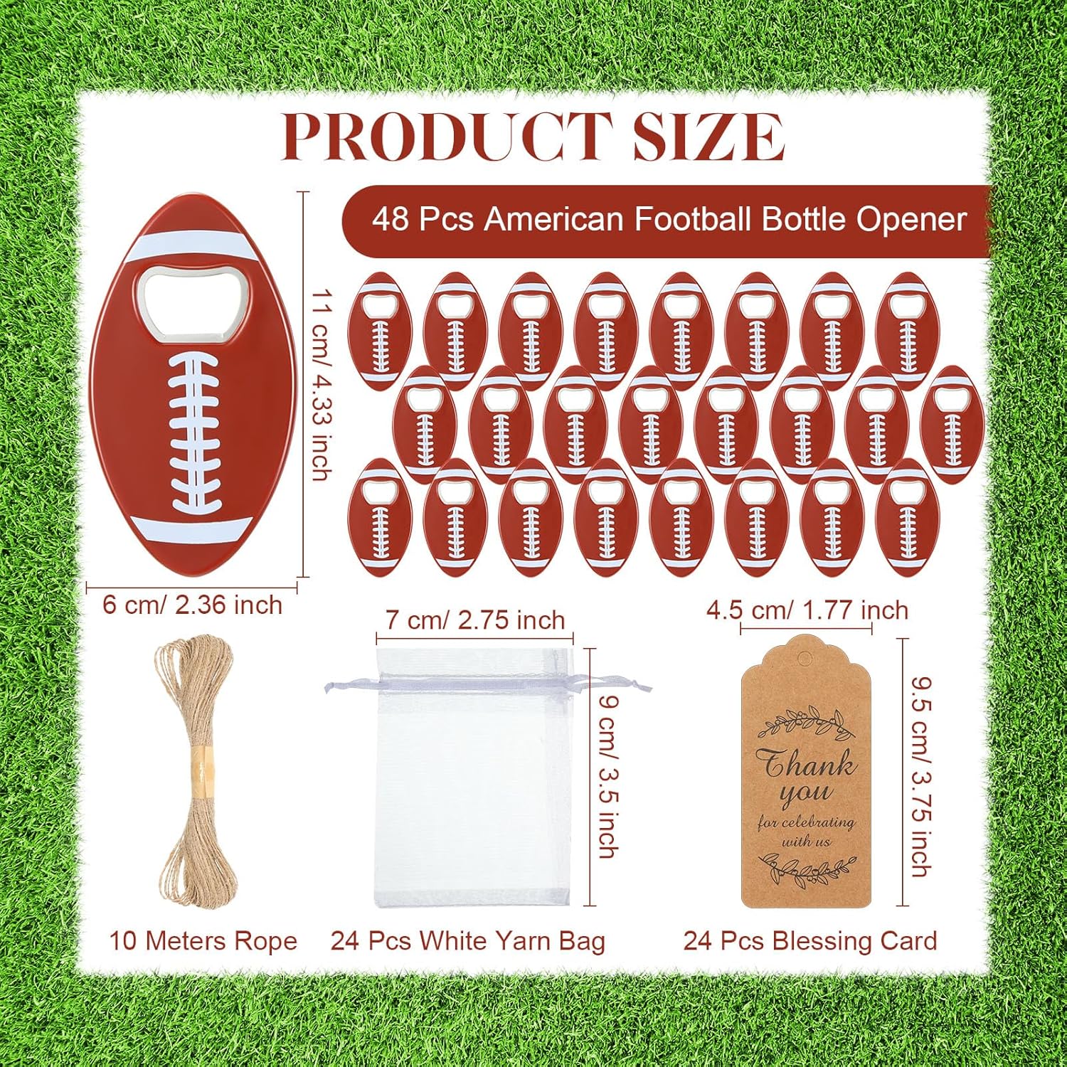 | Included Components | 1 X 32.81 ft/ 10 m long rope, 48 x Bottle openers, 48 x Organza bags, 48 x Thanks tags |