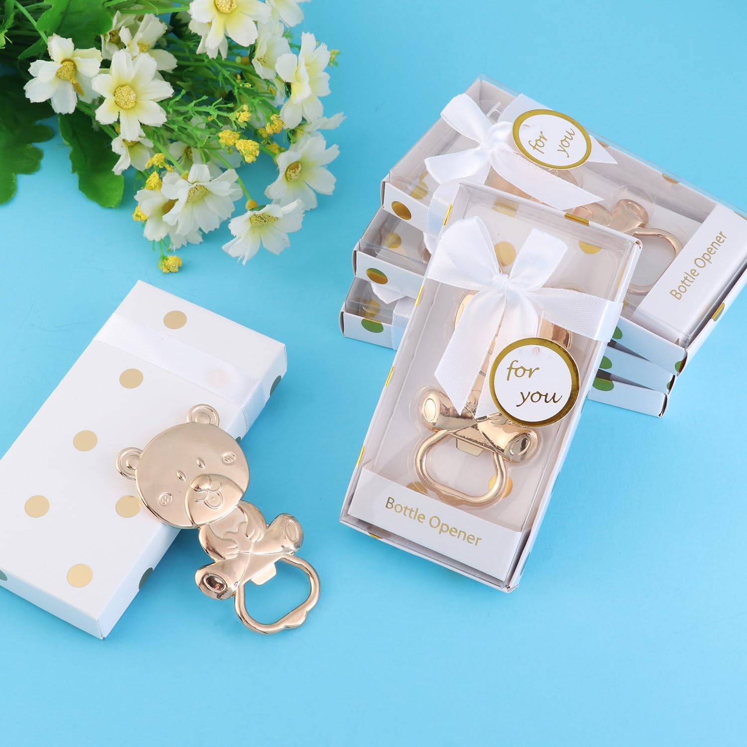 Baby shower party gift presentation includes white base with clear cover, white rope tie and bow, and round,coordinated hang "for you"tag. Each party favor bottle opener has a beautiful small box, elegant and useful, Whenever he again picked up the bottle opener,he thinks about your good times. It is a gift for the best and most creative baby shower and parties,Widely used in weddings, kitchens, birthdays,bars, beach and outdoor dining and hiking. Specifications: Material:Zinc alloy Color:Golden Gift Box Color:white Shape: Baby's Bottle Bottle opener size:3.0*1.4 inches Party favor gift box size:4.7*2.5*1 inch Weight: 54g Package Included: 24 pieces bottle opener party favor for guests Features: Easy to use Creative and interesting design Excellent workmanship,Exquisite packaging Well-made, feel good in your hand, perfect size and design. Unique, and beautiful, they will definitely surprise your friends and guests.