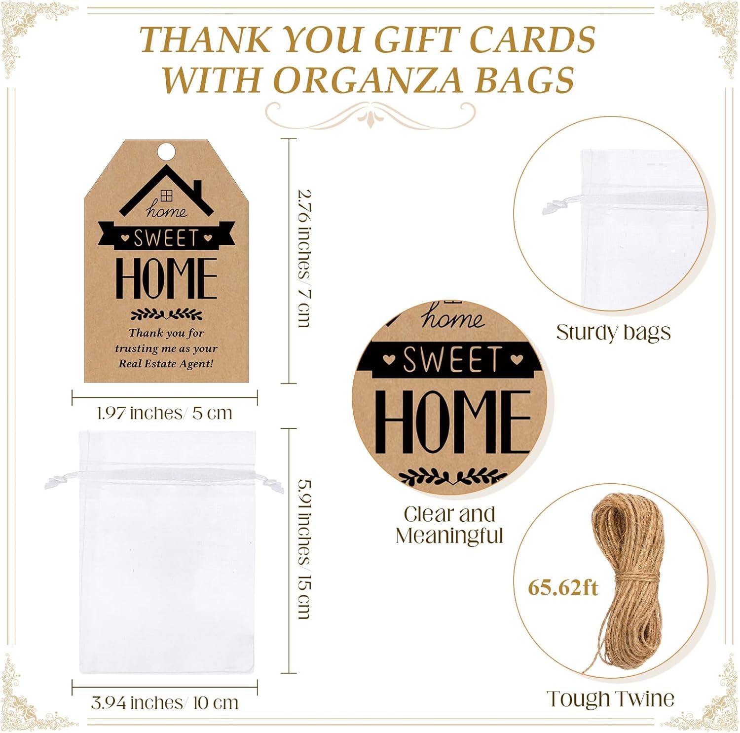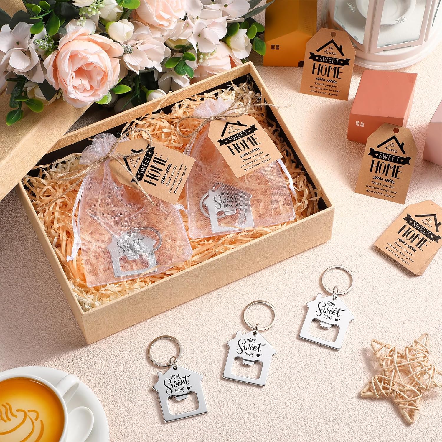 Features: The real estate agent gift set has a classic house shaped design, making it an ideal souvenir or employee gift. The small size can easily fit into your pocket, wallet, or as a key decoration. While the real estate accessories are particularly suitable for real estate agents to give to clients, they can also be applied as memorable housewarming gifts. It is also ideal for transactions, exhibitions and special events. Specifications: Material: aluminum alloy bottle opener keychains, paper thank you cards, organza bag Color: silver bottle opener keychains Size: 1.77 x 1.97 inch/ 4.5 x 5 cm bottle opener keychains, 1.97 x 2.76 inch/ 5 x 7 cm thank you cards Package includes: 50 x Bottle opener keychains 50 x Thank you cards 50 x Organza bag Notes: Manual measurement, please allow slight errors on size. The color may exist a slight difference due to different screen displays.