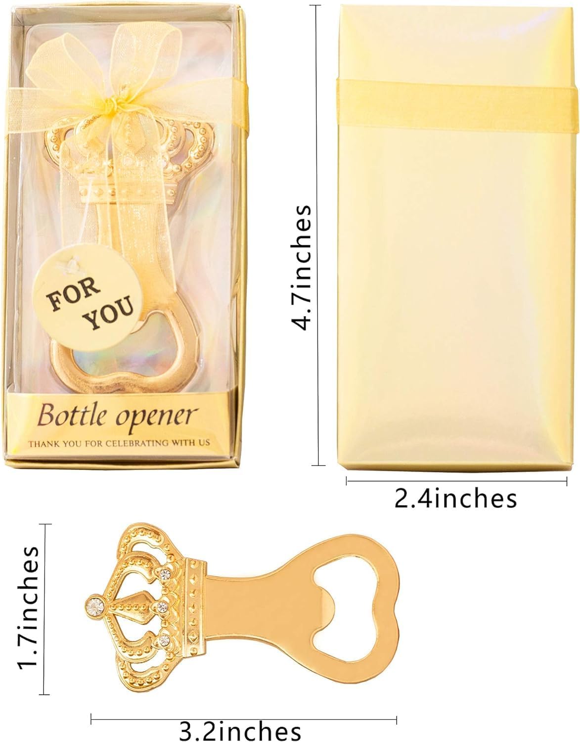 Why Choose the PARTYGOGO Crown Bottle Opener? PARTYGOGO party favor bottle opener adopts the alloy material which has both the texture of heavy metal and the literary retro style. Its perfect mini size is easier to carry and be used at any time. It is also a portable and mini tool for someone likes to drink beer! More importantly, the crown beer bottle opener is a ideal party favor return gift, souvenir, thank you gift in weddings, bachelor parties, birthday party, baby shower, bride shower, etc High-Quality Materials The carefully selected thick, solid, no fading and no rust metal material to protect them from deformation after long-term use Exquisite Workmanship The fine polished surface and smooth personality design of bottle opener reflects PARTYGOGO's exquisite workmanship and effectively extends the service life of the crown beer bottle opener Increasing Atmosphere Creative cool crown style bottle opener makes romance and cute full of your wedding or party, and exquisite gift box packaging increases the festive atmosphere to special days Wonderful Gift This love beer bottle openers with the exquisite gift box are totally suitable for party favors, wedding favors return gift, souvenirs, thank you gift in weddings, bachelor parties, birthday party, baby shower, bride shower, etc After-Sales Service You will get 100% customer support and quality assurance of this bicycle bottle opener set support cushion. For the better shopping experience, please feel free to contact us if you have any questions Specifications Style:Crown Materials:Metal alloy Color:Gold Dimensions:3.2*1.8*0.2 inches Packing:Gift box Package Includes 12 * crown shape bottle opener baby shower souvenirs