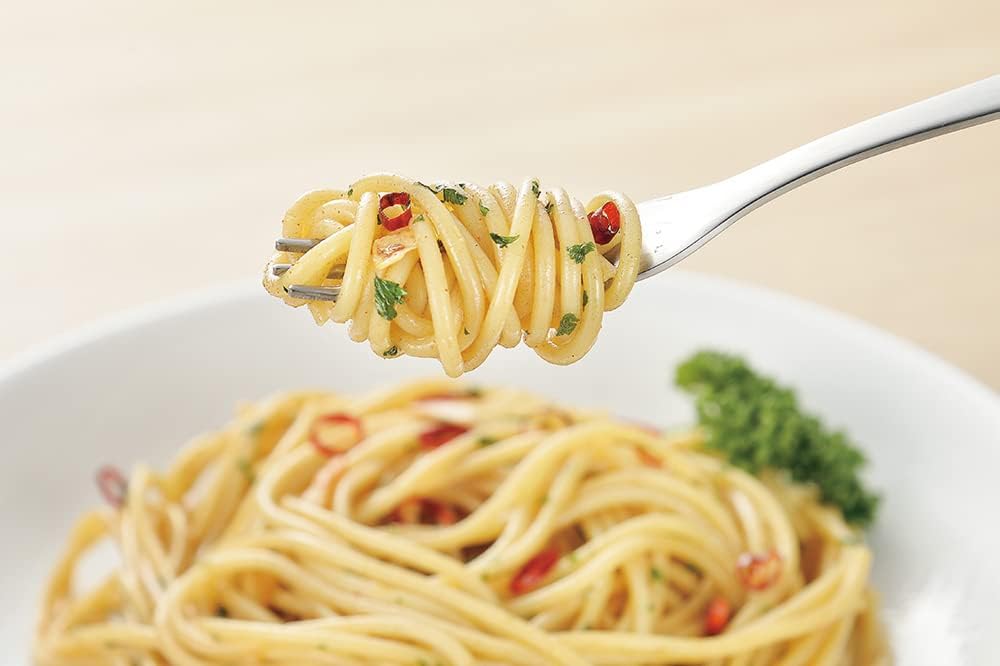 Wavy shape keeps tangled pasta from escaping Long center makes it easy to turn on a plate