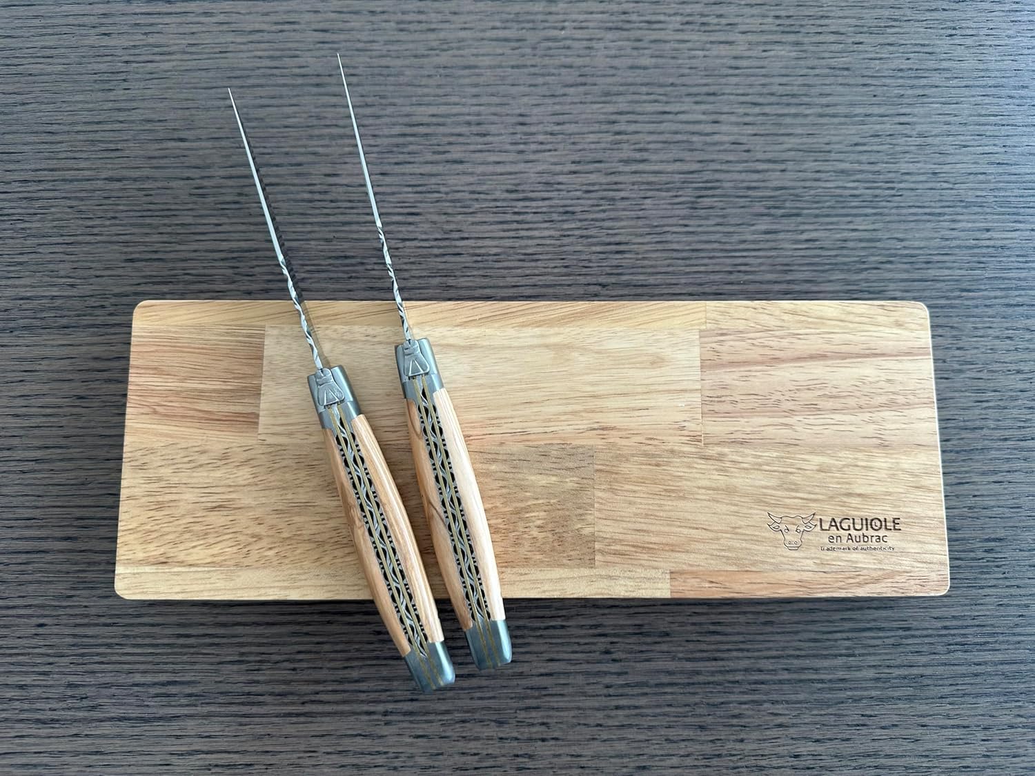 Get real Laguiole steak knives, don’t be foolish by imitators; this is the real thing!Be assured that what you are getting is an original Laguiole en Aubrac set of steak knives made by master craftsmen with authentic materials Genuine Laguiole en Aubrac steak knives are hand-made in France by master craftsmen with authentic French components and are guaranteed for life. These genuine Laguiole steak knives are the best addition for your kitchen. The blades are made of ultra strong 12C27 Sandvik Stainless Steel with a thickness of 3mm. 12C27 is a martensitic stainless chromium steel. The composition of carbon and chromium gives a unique combination of properties including: very high hardness, very high wear resistance and corrosion resistant Packaged in a handsome French Oak gift box. Individually hardened by hand; shaping and fitting are done by hand to the craftsman’s eye. Each knife is assembled from start to finish in one sequence and by a single artifice Following Laguiole traditional style, the spring is polished on the inside and forged as one piece with its fly (forged bee). The bee is welded onto the spring matte stainless steel bolster. Blade: 4.25-in Long (11 cm), Total length: 9-in (23 cm) Double plated brass and stainless steel plates Lifetime warranty against manufacturer defects. Any Laguiole en Aubrac product failure resulting in the inability to use the steak knife as it was intended. Laguiole en Aubrac will not repair or replace items that show obvious signs of neglect or intentional damages. Order Today By Clicking On Add To Cart And Enjoy This Masterpiece.