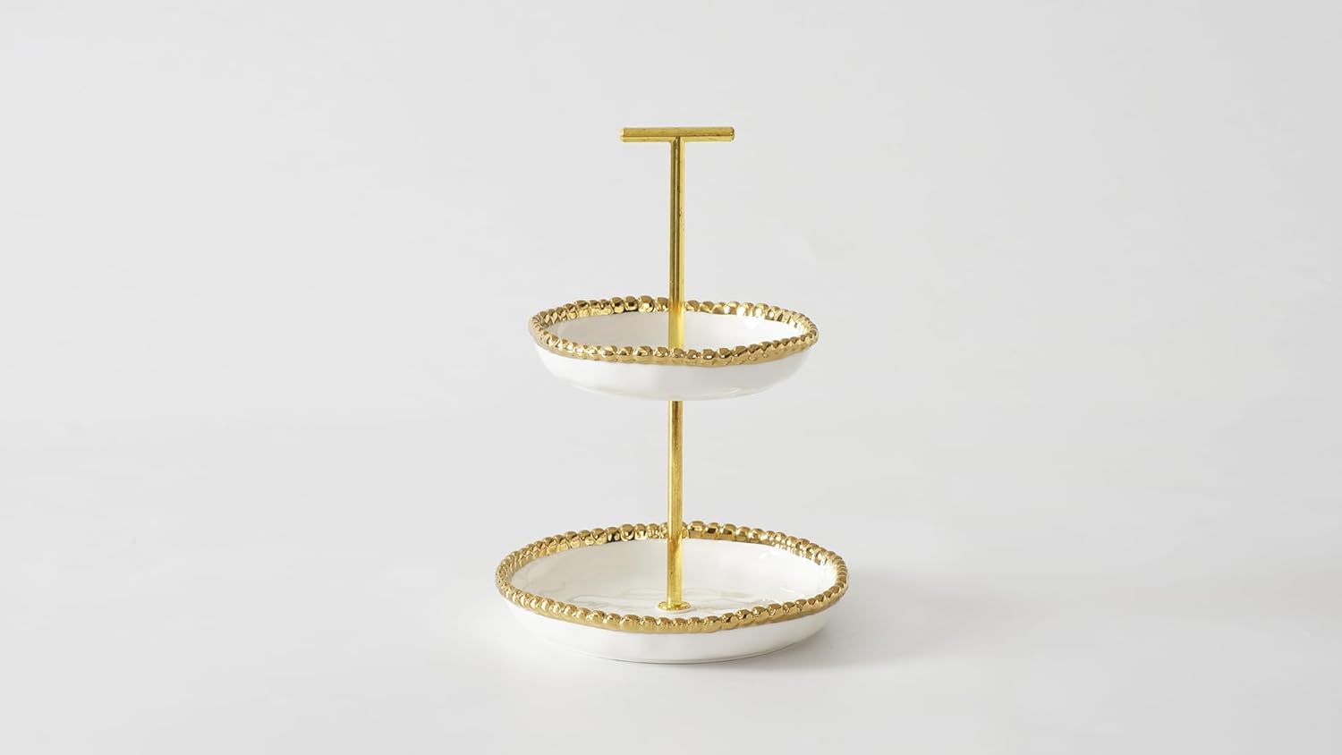 Mini 2 Tier Stand in our Golden Salerno Collection. A great addition to any kitchen, bathroom, or coffee table! Perfect for displaying appetizers or desserts for guests during parties or dinners. Striking and elegant gold titanium beading with high-fired white porcelain. Food safe. Hand Wash Only. Oven safe to 500°. Easy Care.