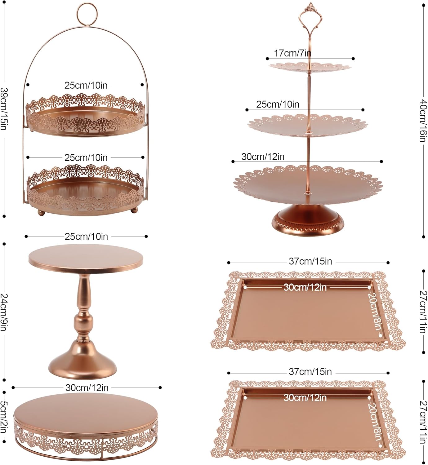 • 6 pieces cake stand set: 1* 3-layer cupcake tower (12in, 10in, 7in), 1* 2-tier cupcake holder( 10in), 1* cake stand with base(10in), 1* round cake pedestal(12in), 2* rectangular serving tray(14.5in*12in);