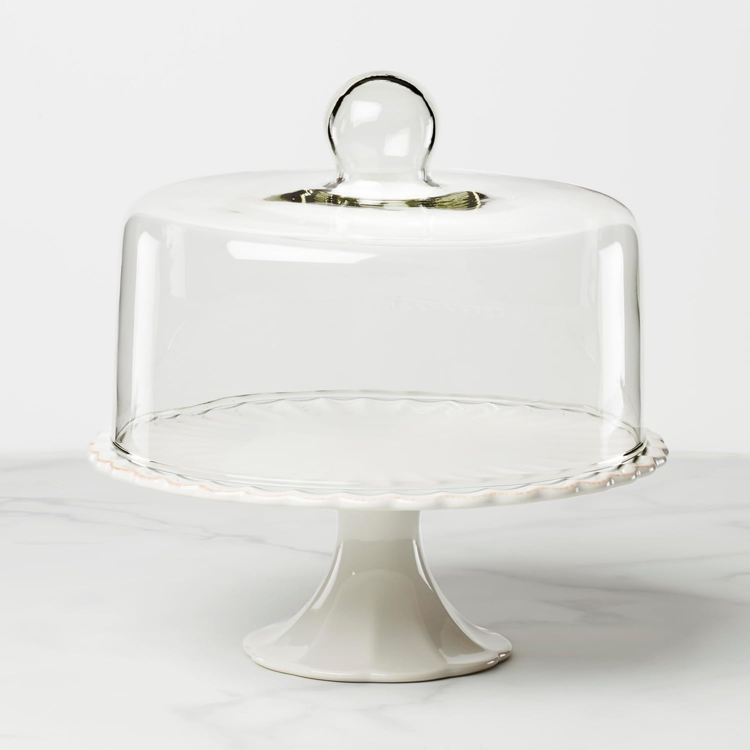 Crafted of durable white ceramic stoneware and featuring a delicate hand-applied tea stain along the rim, this cake plate gleams with a subtle texture of swirling beads and a soft scalloped edge. For added convenience, a dome lid is included to help maintain the freshness of your desserts and pastries.