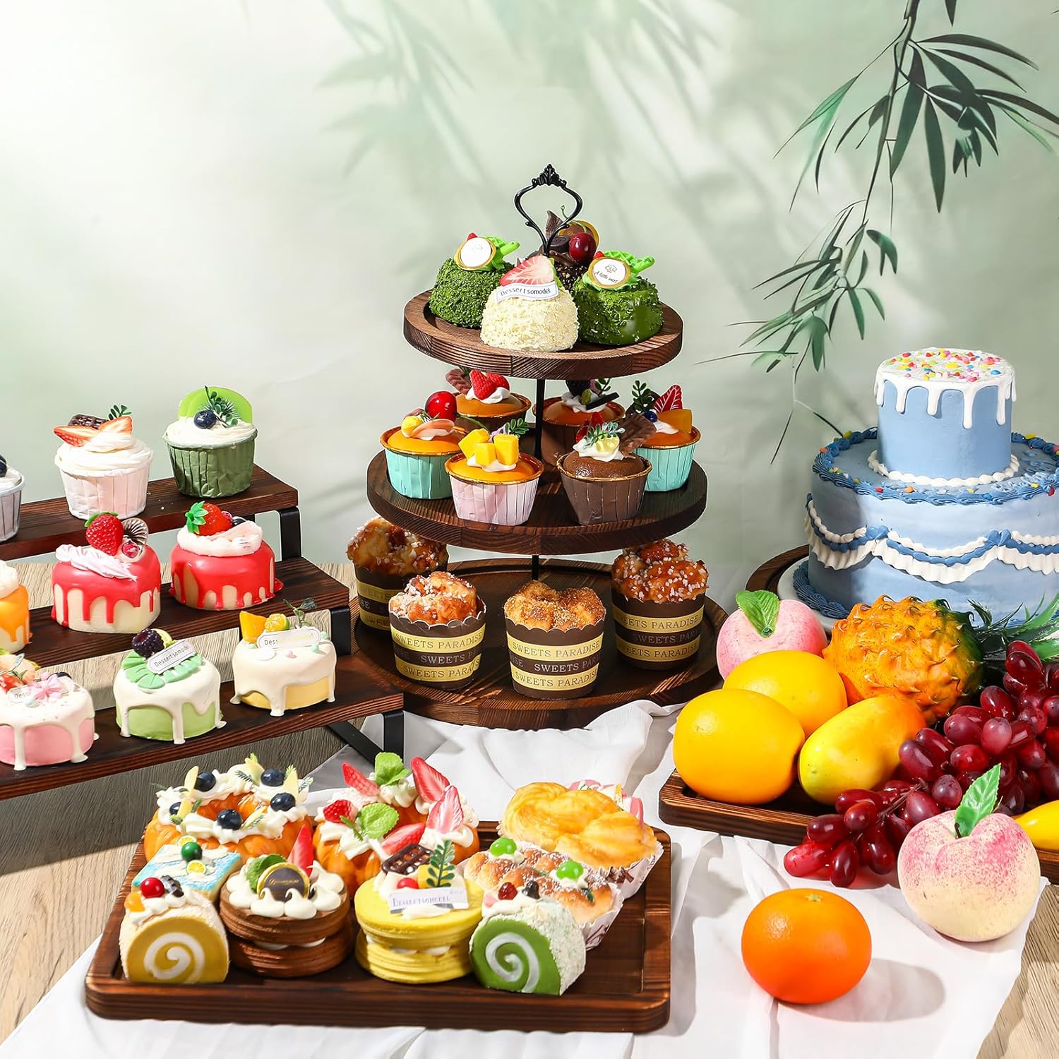 Features: It can be applied for figures, dolls collection, and decorations in the living room, for nail polish, perfume, and makeup on the dresser. Applied for condiments, spices, cans, coffee, and tea in the kitchen. No exaggeration, it can be applied to any corner of the house. To prevent cracking, deformation, and aging of the wood, avoid direct sunlight and regularly coat the surface with oil for maintenance. When storing, wrap it in plastic and store it in a cool, dry location. Specifications: Material: wooden Color: brown and black Size: Wooden dessert tower: 8 inches, 10 inches and 12 inches Wooden tiered display stand: 9×13.8 inches Cake rotatable stand: 12 inches in diameter Square dessert tray: 9×13 inches Package includes: 1 Set wooden dessert tower 1 Set wooden tiered display stand 1 Pcs cake rotatable stand 2 Pcs square dessert tray Notes: Manual measurement, please allow slight errors on size. The color may exist a slight difference due to different screen displays.
