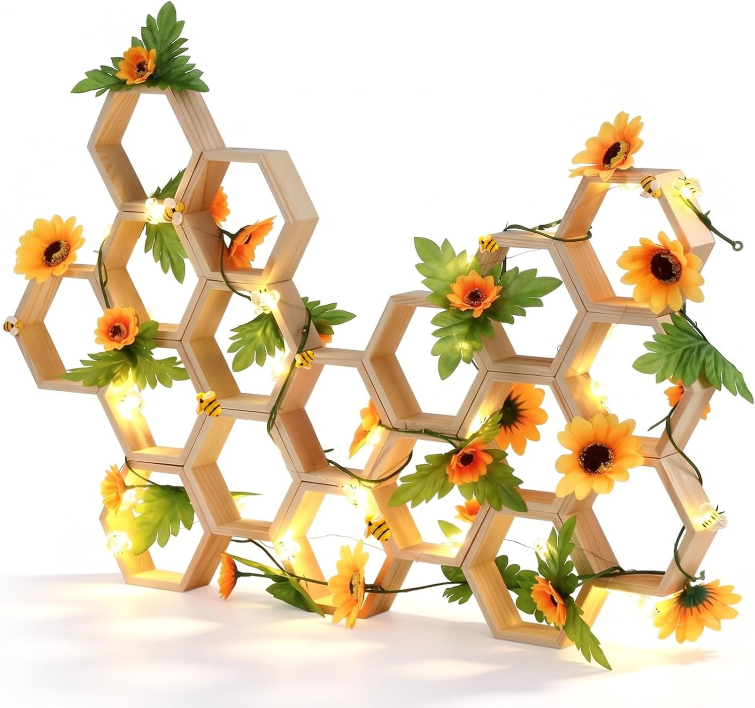 Features: Home Decorations: These decorations are charming home decorations items in themselves. You can arrange the hexagonal components in geometric patterns on a table or wall, use lighting to illuminate a bedroom or balcony, and let the sunflowers add a bright touch of color to your room. Easy to Use: You can place these resin bee on the cupcake stand. The light fixture is pre-installed and can be hung directly. The sunflower vines can be twisted, curled, or trimmed to suit your space. Specifications: cupcake stand: wood, bees: resin, lights: plastic Color: yellow Size: hexagon Stand: 4.1" D x 1.4" Thick. Resin Bees: 0.55", 0.74", 0.98" H. Sunflower Vine: 90.1" L. Bee String Light: 118" L Package includes: 18 x Mini Wooden Hexagon Stands 30 x Resin Bees 2 x Sunflower Vine Garlands 2 x Bee LED String Lights Notes: Manual measurement, please allow slight errors on size. The color may exist a slight difference due to different screen displays