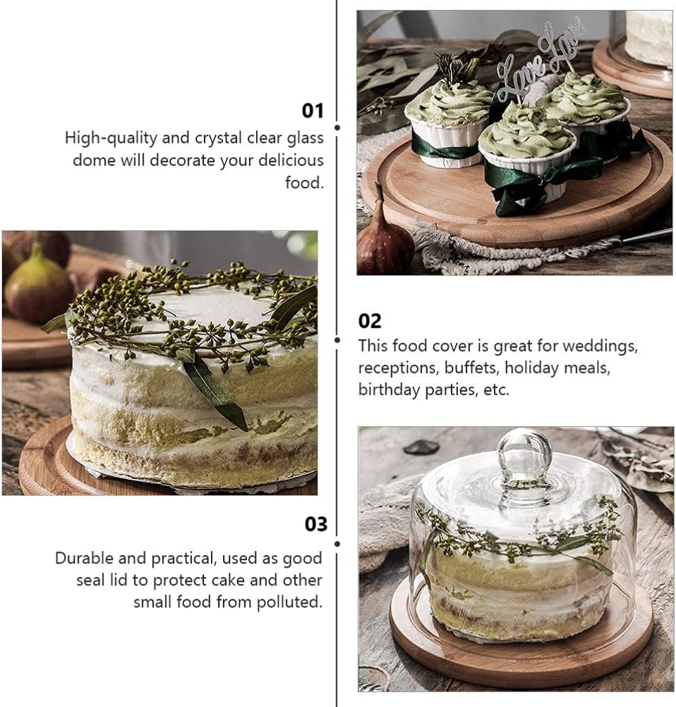Description The item is a glass cake cover for keeping food fresh. It can be used for bread, cupcake, or fruits storage cover. Durable and practical, used as good seal lid to protect cake and other small food from polluted, and with transparent design, you can recognize the food inside without open it for each time. Features- Color: As shown.- Material: glass.- Size: About 18. 00X18. 00X14. 00cm/ 7. 07X7. 07X5. 50inch.- and crystal clear glass dome will decorate your delicious food.- This food cover is great for weddings, receptions, buffets, holiday meals, birthday parties, etc.- Durable and practical, used as good seal lid to protect cake and other small food from polluted.- Fine craft make it not easy to deform and safe for food storage.- Proper size will not take too much place for keeping cake, snack, breads, fruits from outside . Portable and creative.- Color: Khaki.- Size: 18x18cm. Package Including 1 x Glass Cover 1 x Round Tray