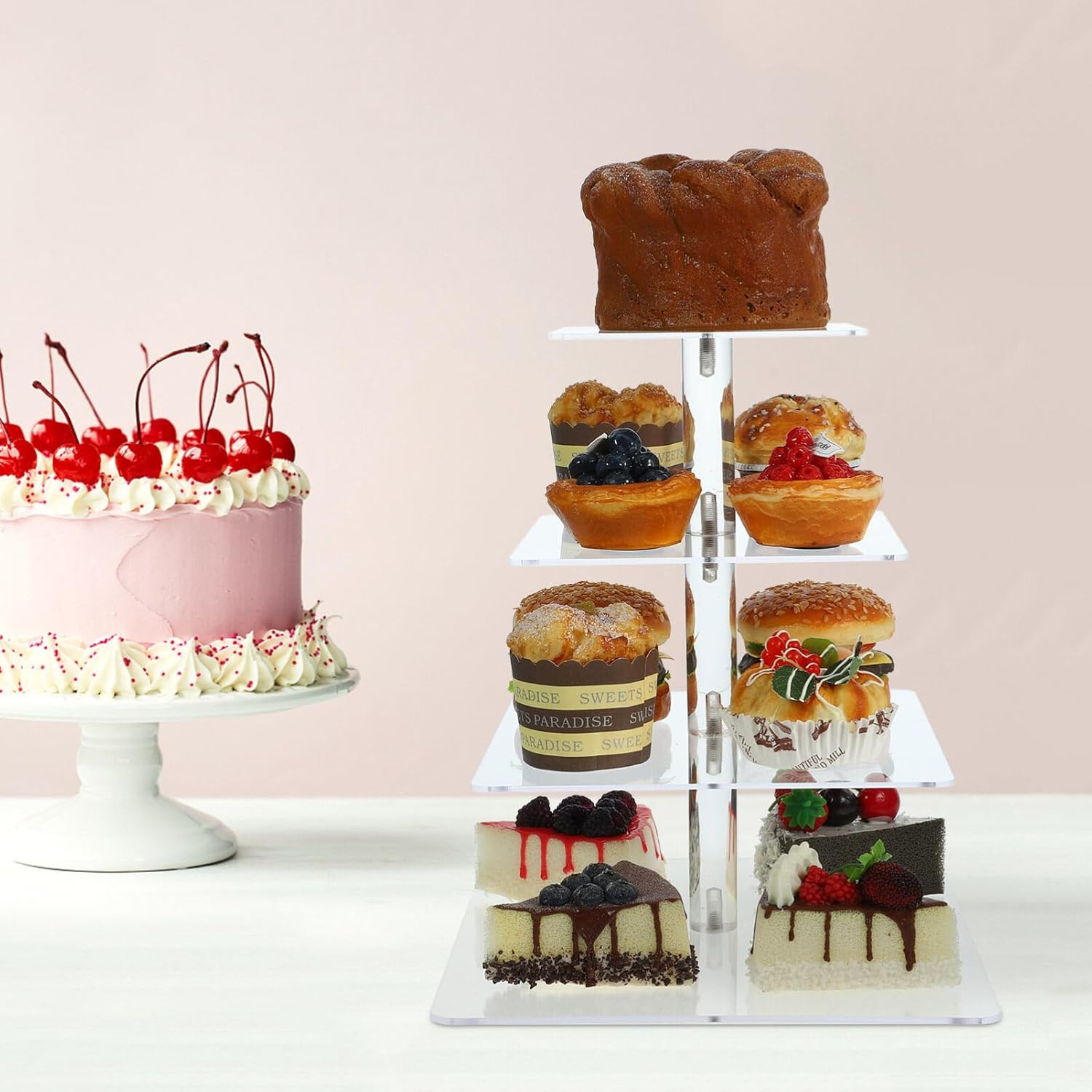 DescriptionThis display stand is for showcasing your cakes, pastries, other baked goods. Made with a sturdy frame and transparent acrylic material, it is and long-lasting. The versatile design allows for different shapes and sizes of baked goods to be displayed, making it a great addition to any bakery or home kitchen.Features-Color:Transparent;-Material:Acrylic;-Size: 31.00X26.30X26.30cm/12.18X10.34X10.34in; - This multi-layer cake display stand allows you to showcase multiple cakes or desserts, adding elegance.- Crafted from material, this cake stand is constructed with acrylic, ensuring long-lasting use with clear views.- With its versatile design, this cake display stand is for various occasions such as weddings, birthday parties, very decorative.- Featuring a minimalist and fashionable design, this cake stand adds sophistication to any decor style, effortlessly blending aesthetic.- Designed for convenience, this cake display stand is easy to display, used for effortless cleaning and convenient storage when not use.Package Including1 x display stand