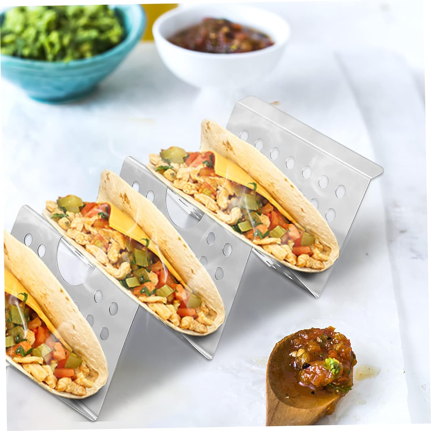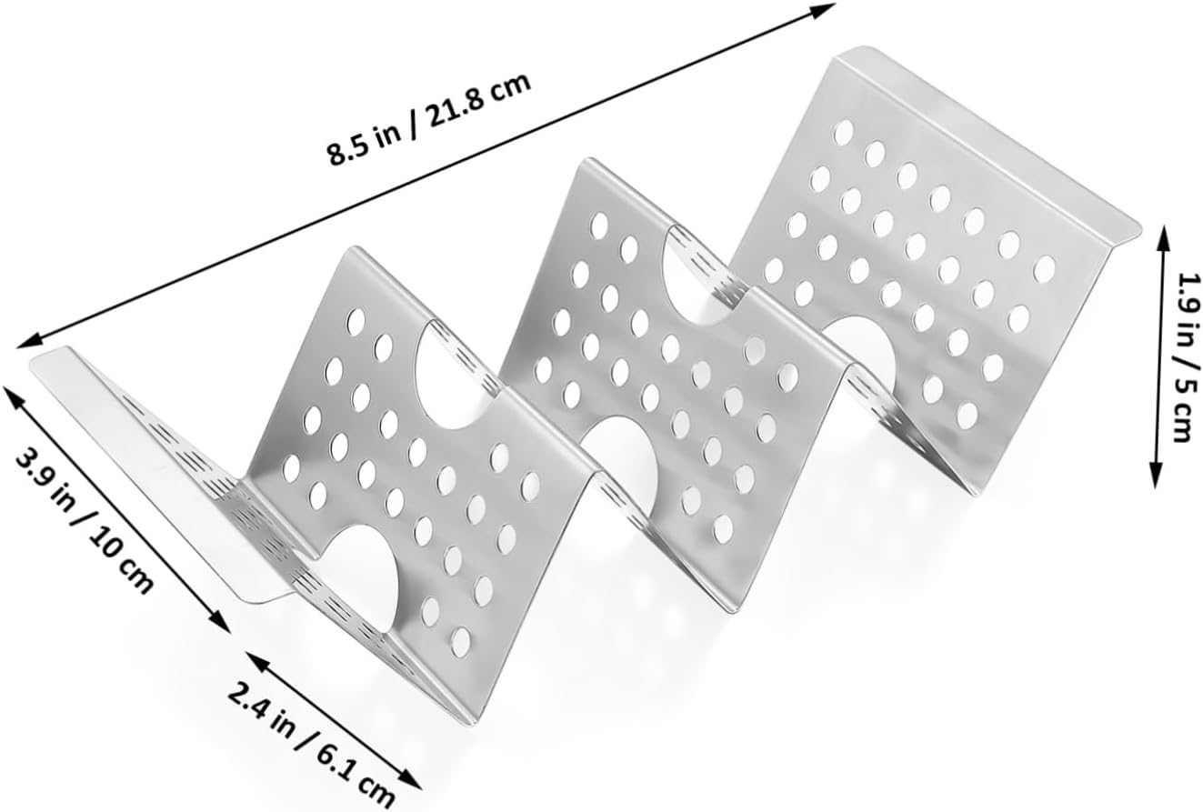 Package Include 8 x Taco Holders Characteristics -Color:Silver stainless steel taco holders -Size: About21.70X10.00X5.00cm/8.53X3.93X1.97inches taco holder -Material: Stainless steel taco rack with handle -They will keep the tortillas upright, whether they are putting on plates or baking in the oven . - for hosting family gatherings,fast-moving restaurant kitchens, and holiday parties metal taco holder. -Taco holders can be used to placeburritos, tortillas, hot dog pancakes, and more food taco holder taco tray with handle -There are many small round holes on eachside of the taco stands, which can heat up rapidly taco tray. -Made of stainless steel material, which isvery strong and safe and will not bend or deform taco tray holder.Goods Descriptionkitchen taco holder Designed to keep your food upright andbeautifully presented.taco stands The weldingprocess is stable and strong.burrito holder Whether you're having a party or simply cooking dinner,your delicious Mexican-style food will look portioned.pancake holder plate The taco holders are made of stainlesssteel, sturdy and wear-resistant