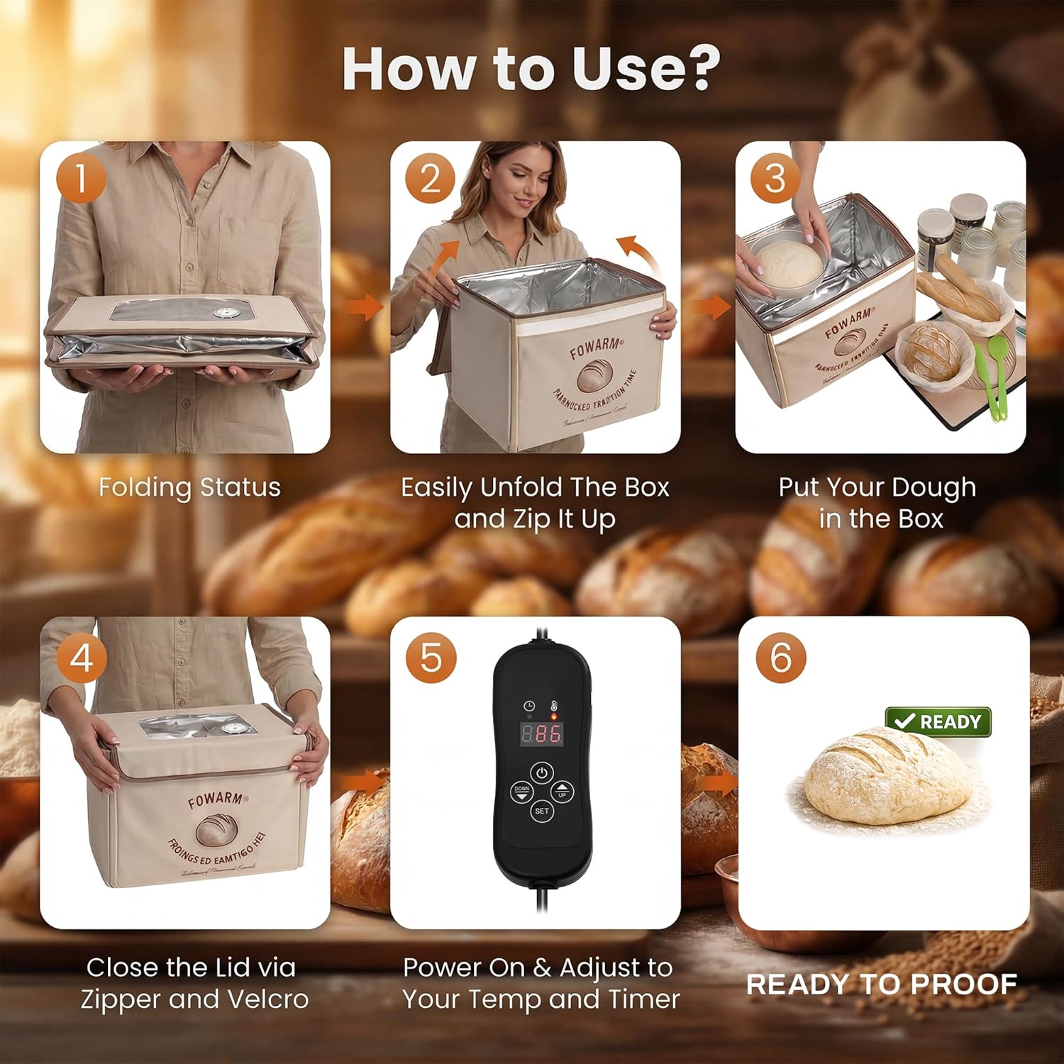 Create consistent fermentation at home with this folding bread proofing box. Featuring 32–108℉ precision temperature control with 1℉ adjustment, it supports low-temperature fermentation and warm proofing for bread, pizza dough, and sourdough starters. A 3-sided heating system provides even warmth, while a built-in NTC temperature sensor helps maintain stable conditions. The 24-hour timer with auto shutoff allows hands-off proofing, and the humidity monitor helps reduce guesswork for better dough texture. Designed for modern kitchens, the foldable structure offers ample space yet stores flat when not in use. With a clear viewing window and 65W energy-efficient operation, it delivers precision, control, and everyday convenience for home bakers.