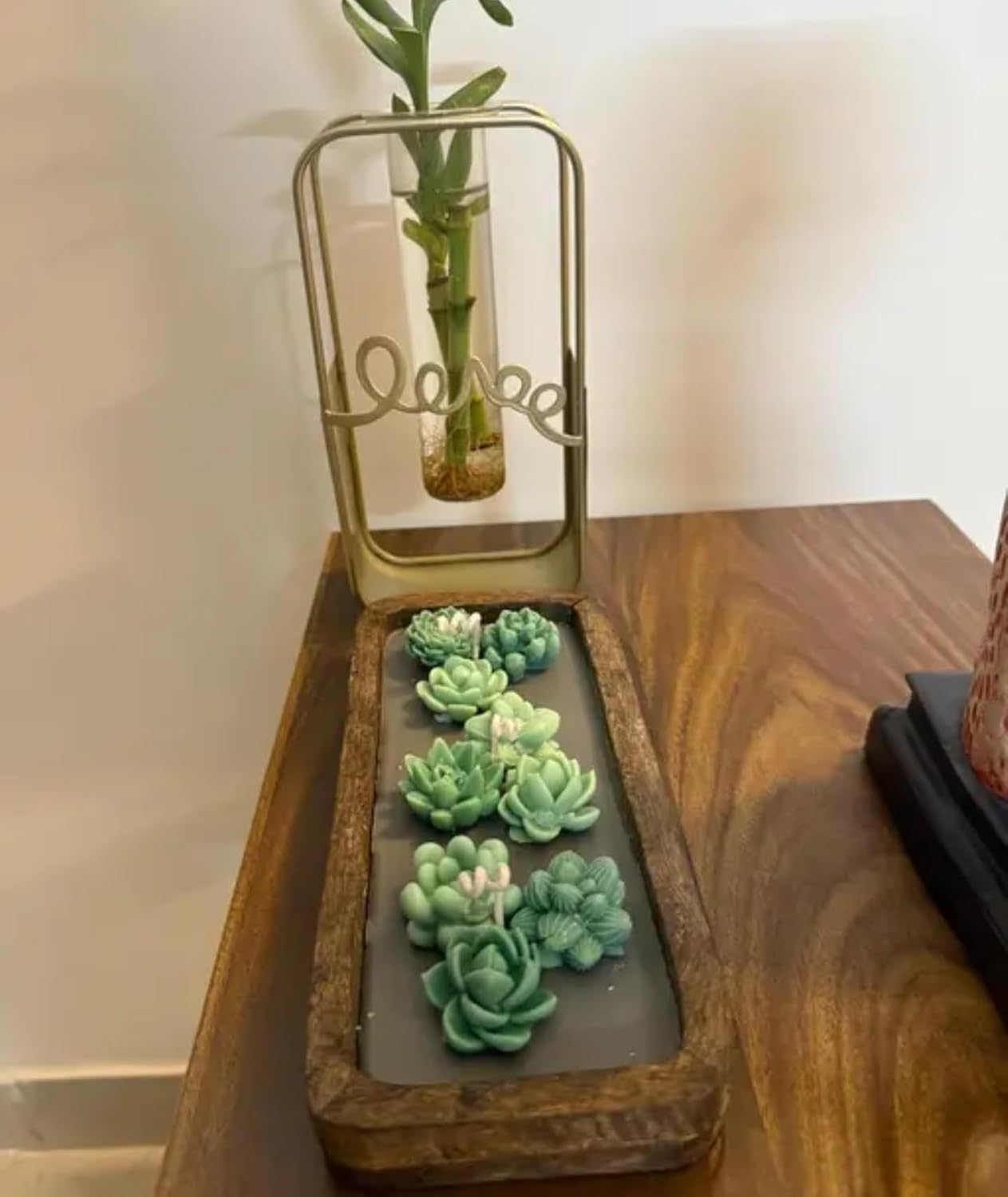 Transform your space with this enchanting handcrafted succulent candle set nestled in a rustic wooden book-shaped holder. Each mint-green succulent candle is meticulously detailed to capture the delicate beauty of real succulents, creating a serene botanical display. The vintage-style wooden holder, designed to resemble an aged book, adds a touch of literary charm to your décor. Perfect as a centrepiece for your dining table, a decorative accent for your bookshelf, or a thoughtful gift for nature and book lovers alike. The candles feature intricate petal formations and a soft, calming hue that brings a subtle pop of colour to any room. This unique combination of natural elements and literary design makes for a conversation-starting decorative piece that bridges the gap between botanical beauty and vintage aesthetics.