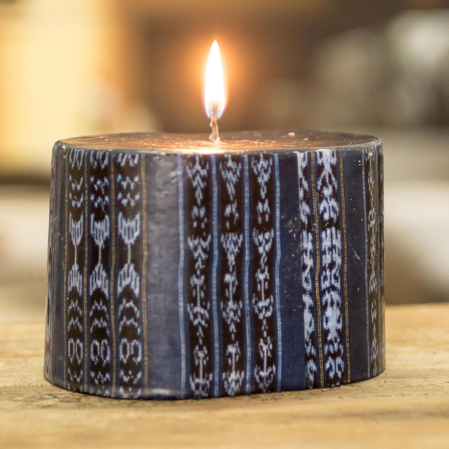 Novica works together with talented artists, artisans, and designers around the world to produce stunning, keepsake handmade treasures.About this item: In Guatemala, each Mayan town and village has a distinctive pattern of handwoven fabric worn by the women. Guatevelas selects a print of the textiles from Santa Catarina Palopo to decorate this rectangular candle in shades of blue. It is crafted by hand.Hand-crafted item -- color, size and/or motif may vary slightlyNever leave a burning candle unattendedKeep away from and petsFor best results, always trim wick 1/4 inch prior to lightingDo not burn for more than 3 hours at a timePlace candle on a heat-resistant surfaceAbout our Artist: ???My name is Luis Fernando Martínez. I was born in 1960 in the beautiful department of Quetzaltenango; here I grew up with my parents and siblings. My father was a merchant and my mother a housewife. I continued my hood in the capital of Guatemala, where I finished high school and university. ???A few years ago I was very inspired by the beauty of African patterned candles and thought the concept would apply beautifully to Mayan textiles. I started just 6 months ago with a small group of artisans dedicated to candle making, who come from handicraft-making families for generations. This is an art that involves processes with a lot of dedication, patience and precision. They have almost 25 years of experience, and together we started working on this beautiful project. I make the designs totally inspired by the beauties of Guatemalan textiles, and they elaborate and shape each of these designs in a wonderful way in wax. ???Candles bring magic as they are a manifestation of fire--one of the four elements--that has captivated humanity since primitive times; fire also represents purification. Candles are the most beautiful expression used in ceremonies and rituals, even the