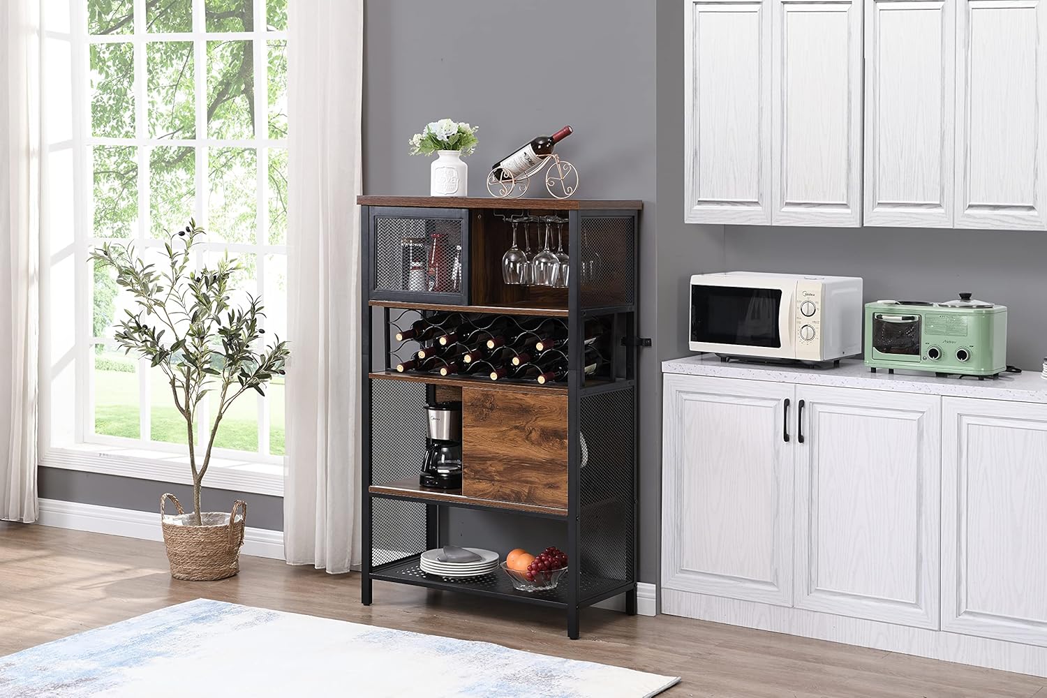 Industrial Bar Cabinet with Wine Rack for Liquor and Glasses, Wood and Metal Cabinet for Home Kitchen Storage Cabinet