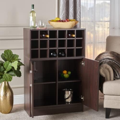 The ultimate wine cabinet, with room for 18 bottles up above and all the glasses you need down below. Built with the highest quality materials and to exacting specifications to ensure a fine quality of craftsmanship. A piece for a true connoisseur. Product Details Includes: One (1) Cabinet Material: Faux Wood with Faux Wood Overlay Finish available in: Sonoma Gray Oak or Wenge Assembly Required Dimensions: 14.75"D x 28.15"W x 42.50"H