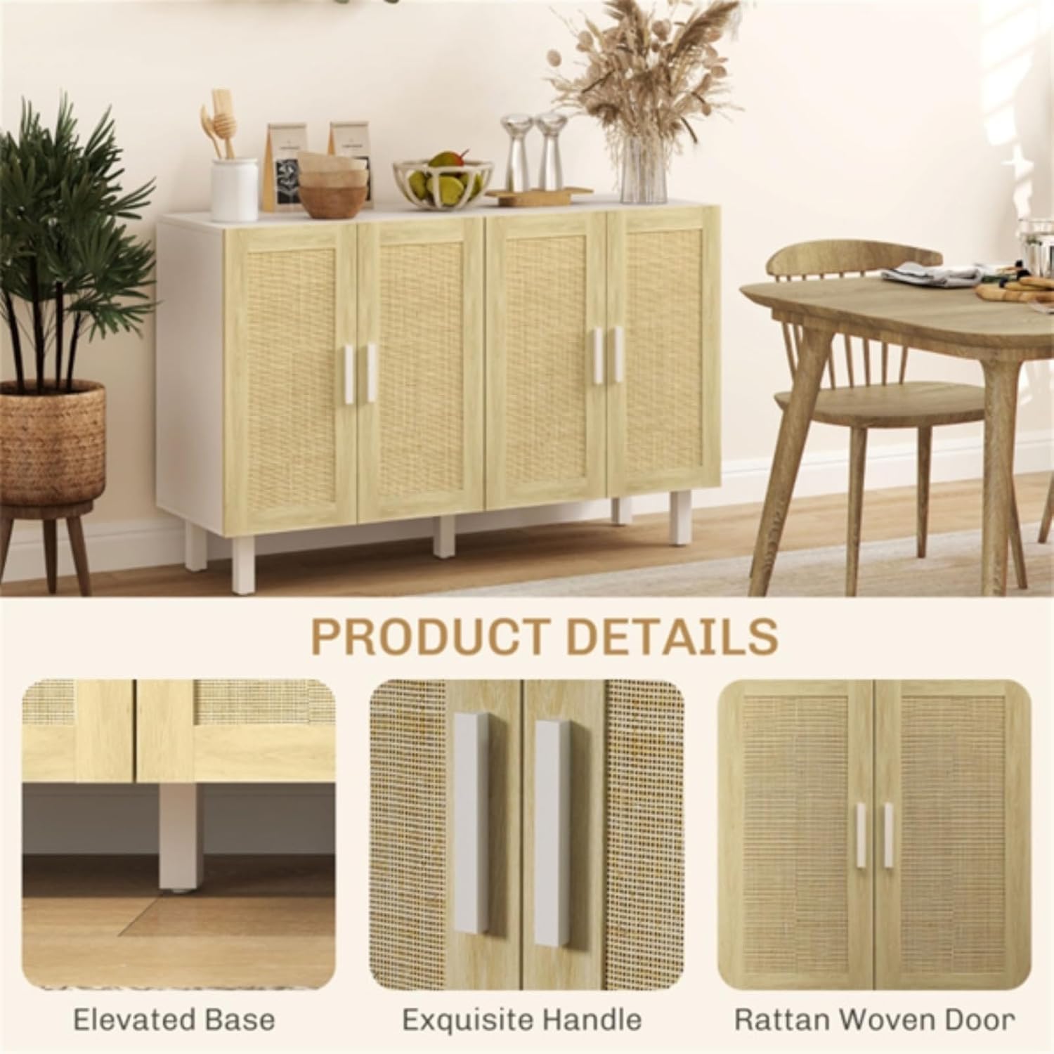 Specifications: - Color: White and Natural - Material: Particleboard - Overall Dimensions: 47.2"L x 15.6"W x 29.9"H - Door Dimensions: 11.7"W x 24.8"H - Shelf Height (Middle): 10.9" - Weight Capacity: 44 lbs (Overall), 11 lbs (Each Shelf) Package Includes: - 1 Sideboard - 1 Manual Unique rattan woven door with natural finish for a bohemian feel, 2 tiers give you plenty of space to store accessories, tableware, dry goods, plates, linens or books, adjustable shelves allow you to store larger items