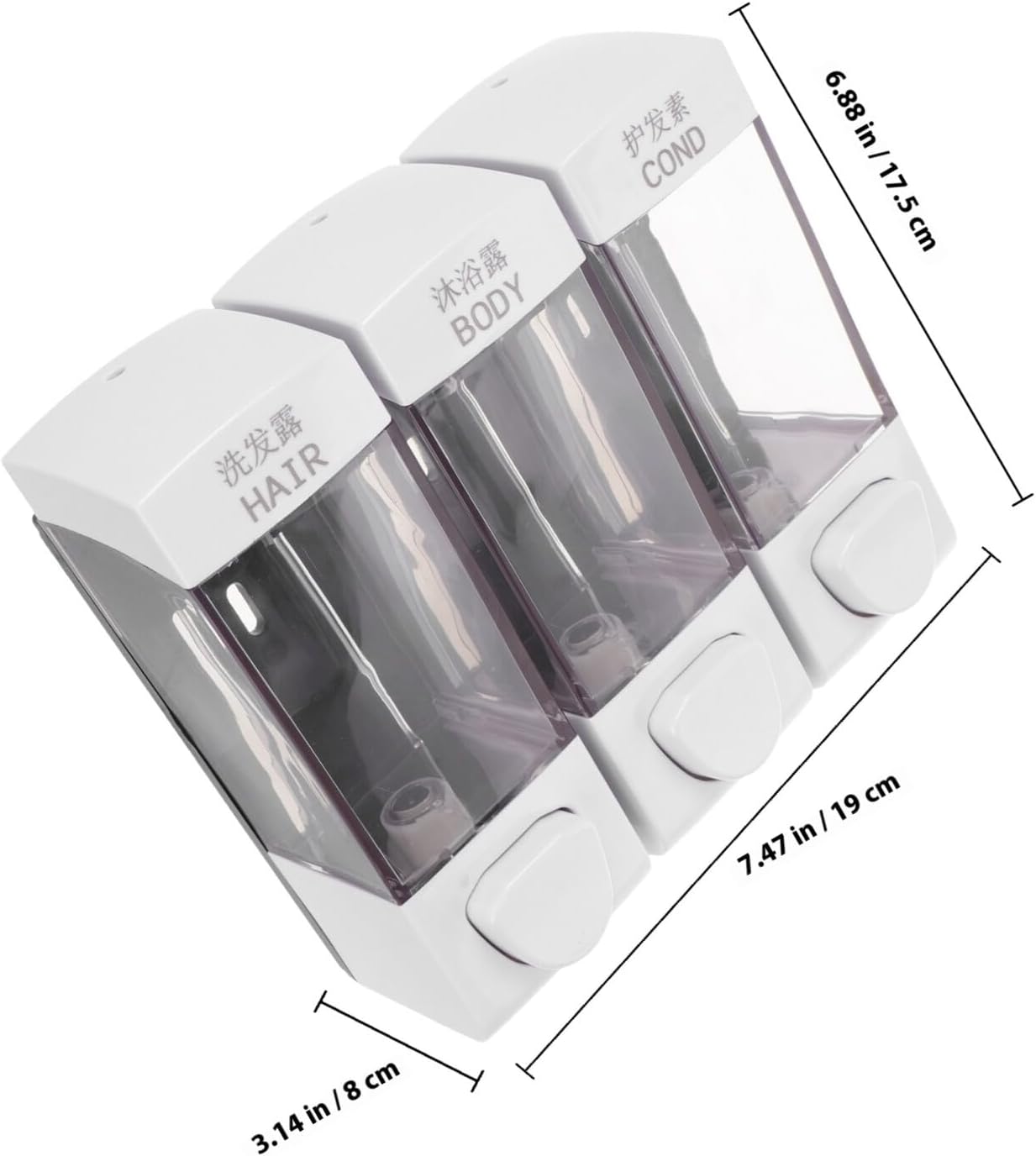 Package Include 1 x soap dispenser (3-chamber style) Characteristics - Large Capacity: Each chamber is large enough to avoid frequent replenishment. Visible window allow you check wall-mounted soap dispenser -Color:Multi -Capacity: Totally 1050 ml bathroom shampoo holder - Convenient and Practical: Wide-opening and refillable bottles can be removed to cleaning and refilling, give you more convenience soap dispenser - Easy to use: Press button make it easy to dispenser just the right amount of soap. No leakage, meet your using needs shampoo shower dispenser -Size:19.00X17.50X8.00cm/7.47X6.88X3.14in -Product Info:Soap dispenser shampoo box -Material:ABS - Selected Material: Shower soap dispenser 3 of ABS material, strong and wear resistant, easily distinguish - Convenient use: Three-head design for family use. Wall-mounted design of this shampoo dispenser saves space shampoo dispenserGoods Descriptionshower wall mounted dispenser This soap dispenser is a very practical and reliable for your needs.shower gel pump dispenser The craftsmanship can serve you well without breaking easily.shampoo dispenser pump The soap dispenser bottle is convenient and practical, with excellent texture, and can serve you for long time without being easily damaged