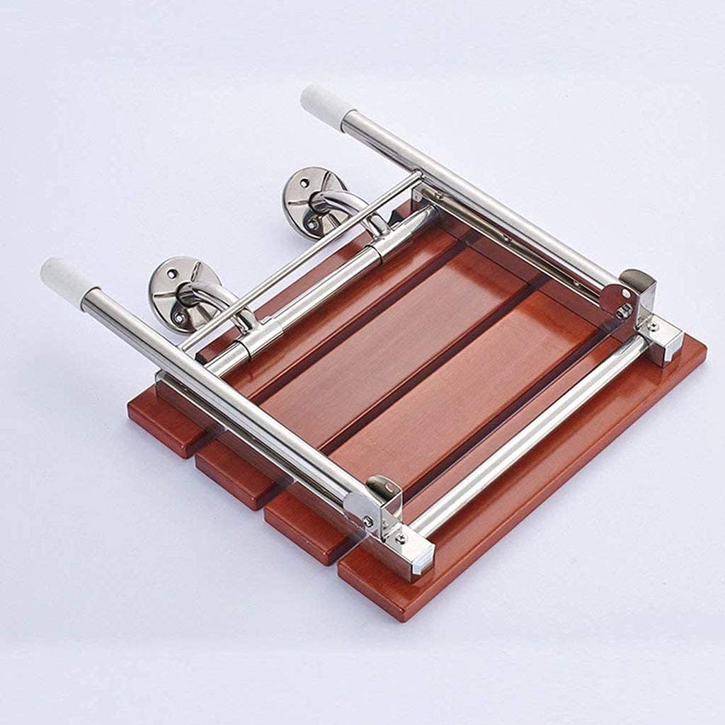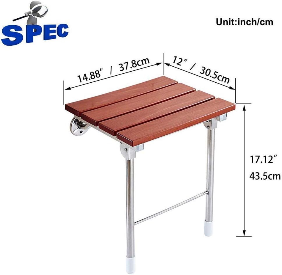 PREFACEThis folding shower seat is a simple bathroom assistance,for people to rest and prevent slipping while showering.With excellent performance and looks more like a work of art. Not only can it help you to enjoy shower more comfortablely and safely,but also it decorate your bathroom.The texture is smooth and delicate,easy to clean,Simple design,suitable for any style of decoration.Red sandalwood seat board,waterproof,corrosion-resistant,wear-resistant,shiny and beautiful,elegant tones,stable and not easy to deform.SPECIFICATIONSBracket material: stainless steelSeat board material: Red sandalwoodSeat board size: 14.88 (L)*12 (W) / 37.8cm(L)*30.5cm(W)Height: 17.12-inch (43.5cm)Load: 350lbs (160kg) or lessGross weight: 9.9lbs (4.5kg)Target users: It is mainly used by the elderly,pregnant women,children and people with limited mobility.INSTALLATION1. Select the suitable location2. Mark the hole3. Drilling4. Knock the expansion bolt into the wall5. Screw in the screw and fix the baseNOTES1. Please wipe it up with mild soap and clean water after use,Do not use abrasive cleaners or solvents on it.2. The shower seat must be securely fitted to the wall of solid construction.