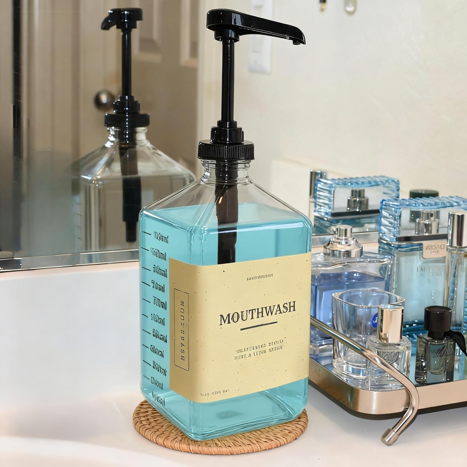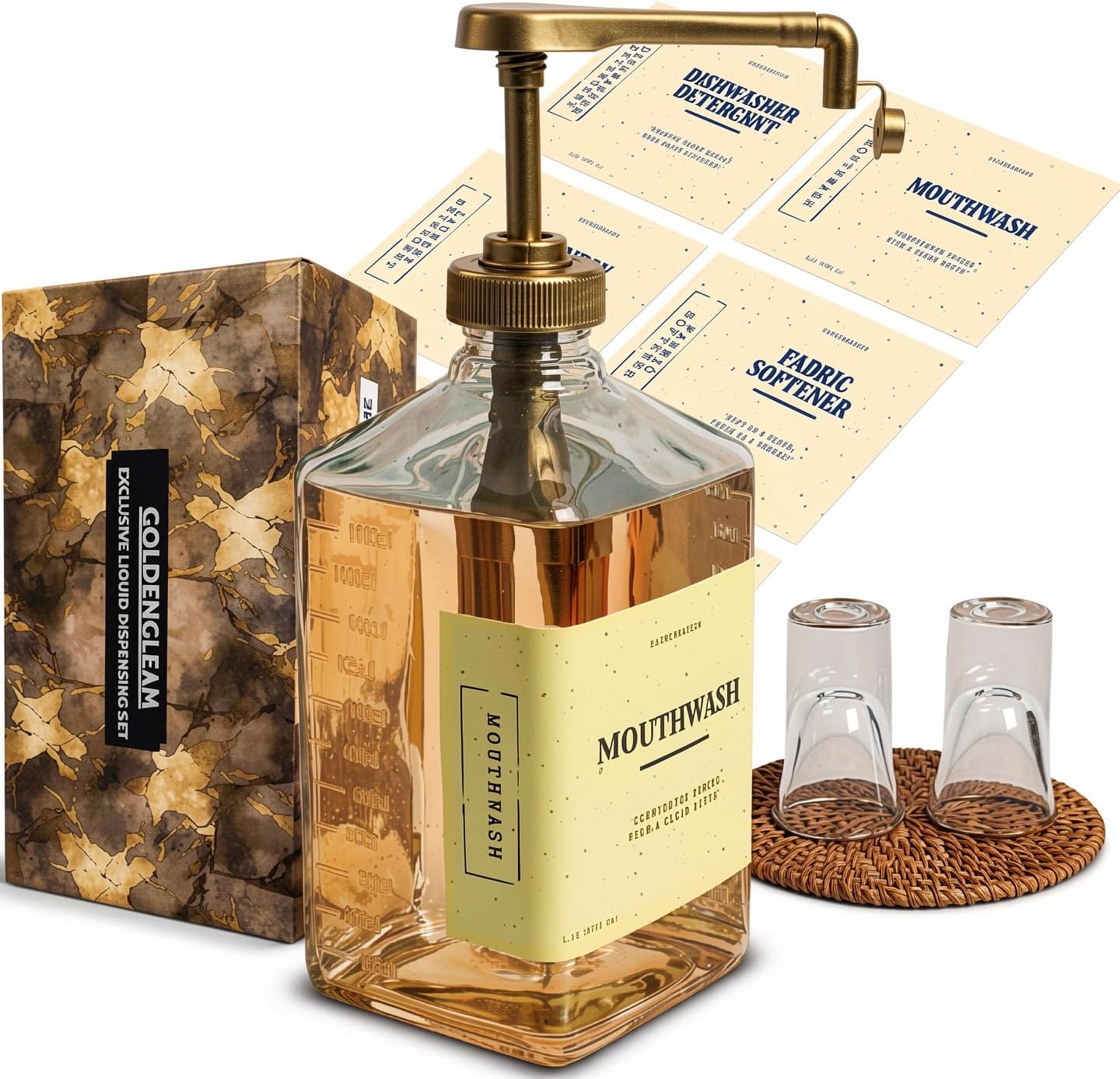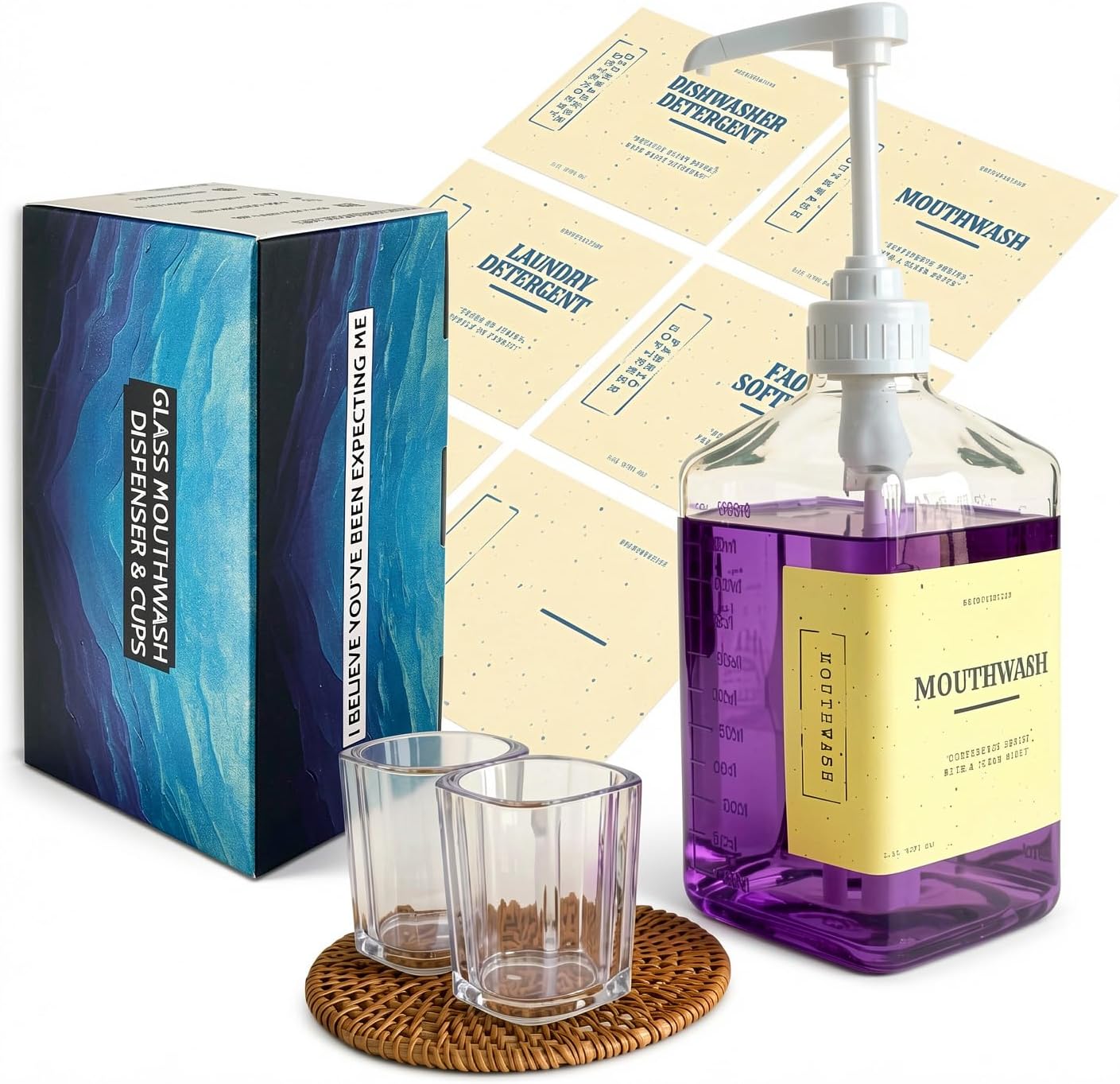 | Included Components | Black pump, Glass mouthwash holder, Two glass reusable rinse cups, Wicker coaster |