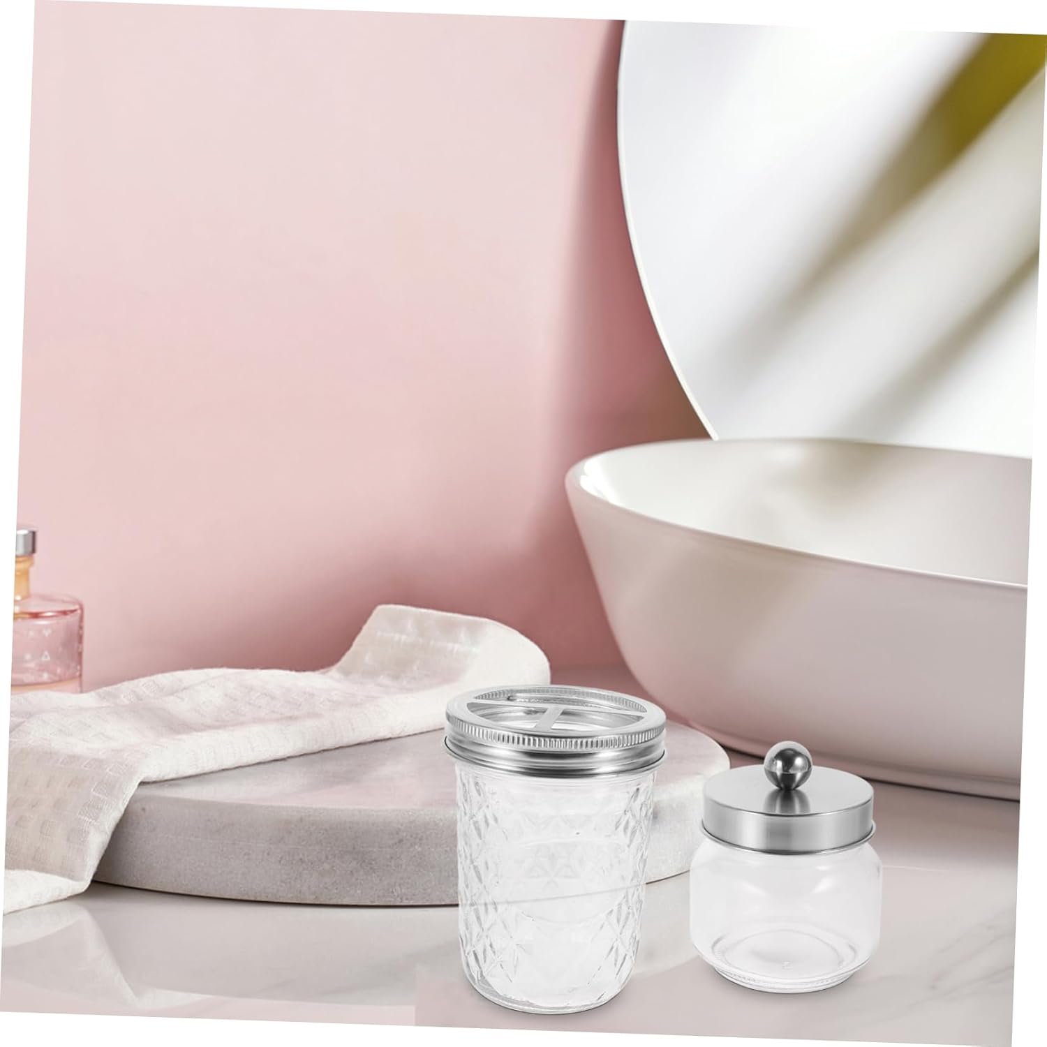 Package Include 1 x Toothbrush Holder Jar 1 x Soap Dispenser Jar 3 x Cotton Swabs Jar Features -Material:Glass, ABS, stainless steel Bathroom Lotion Dispensers -Size:12.00X8.50X8.50cm/4.72X3.34X3.34in Soap Dispenser With Pump -Size:10.00X8.00X8.00cm/3.93X3.14X3.14in Storage Container -Color:Assorted Color Refillable Shampoo Bottles -Size:12.70X8.50X8.50cm/4.99X3.34X3.34in Shower Dispenser -Small size and portable, convenient to carry and store. Simple and classic appearance Shampoo Bottle Dispenser. -This set of bath countertop accessory can meet your essential demands, convenient to use Shampoo Bottles. -This Bathroom Accessories Set will be a for your lover, family, friends and colleagues Tooth Brush Holder. -Bathroom accessories set great as a stylish keep your bathroom essentials in one convenient place Shower Pump Dispenser. -It's a good your lovers, family, friends, wedding or a house warming, to the bathroom with this bathroom vanity countertop accessories set cotton swabs Jar.Goods DescriptionHome Use Soap Dispenser Simple structure and smooth surface.Reusable Shampoo Bottle Fine workmanship and , can ensure the popularity.cotton swabs Jar This is a bathroom personal washing accessories, which is made of stable material for use, not easy to deform or break