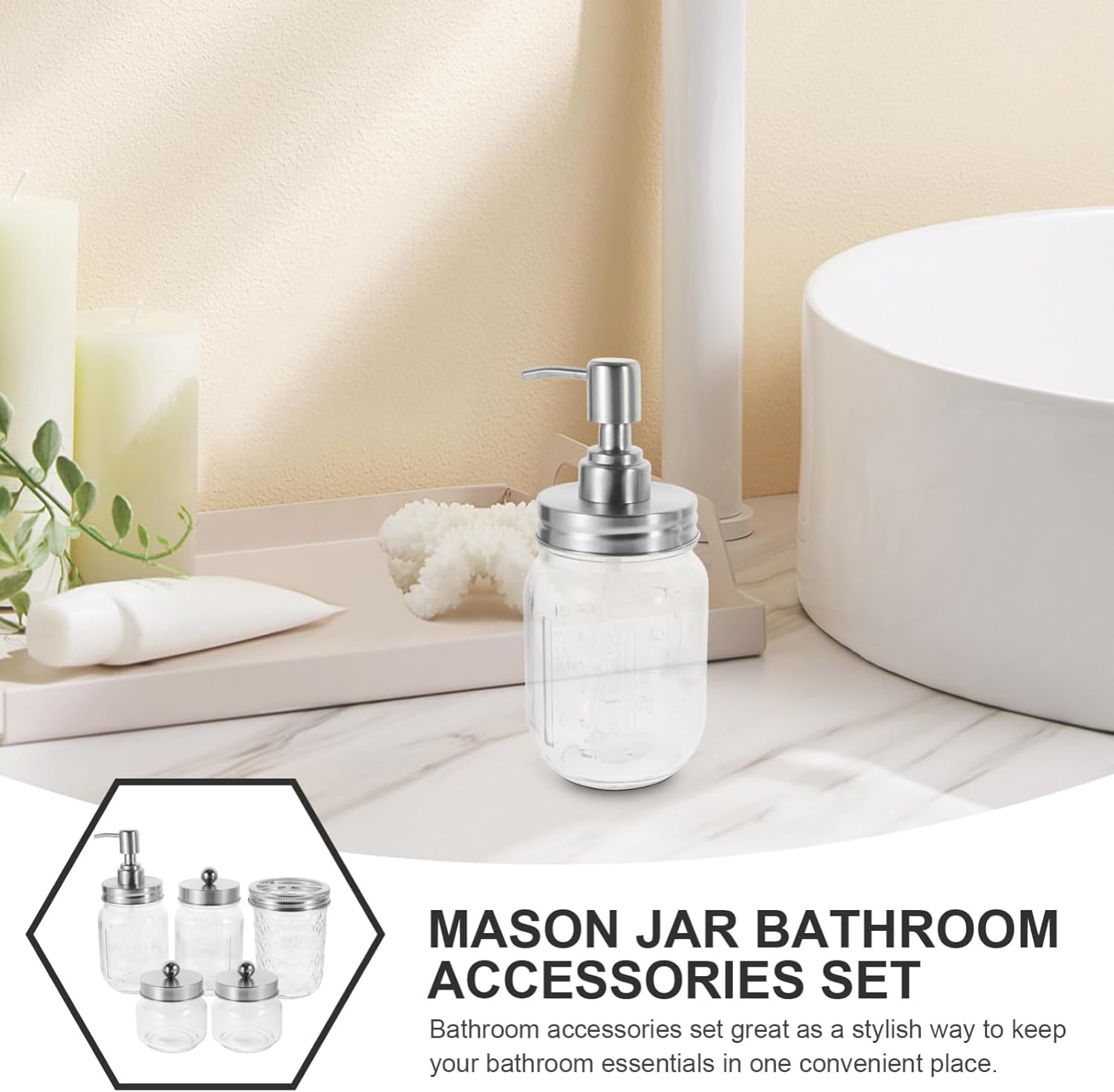 Package List 1 x Toothbrush Holder Jar 1 x Dispenser Jar 3 x Cotton Swabs Jar Features -Size:12.00X8.50X8.50cm/4.72X3.34X3.34in human -Size:12.70X8.50X8.50cm/4.99X3.34X3.34in brush -Material:Glass, ABS, stainless steel Portable Travel Dispenser -Size:10.00X8.00X8.00cm/3.93X3.14X3.14in home -Color:As Shown mounted -The we offered is reasonable and , help you save your money All item come with the compact size, which will not take up too much space spray. -The bathroom accessories are made of good ABS, glass and stainless steel material, which has the Pump Bottle. -Occupy on the table or counter top, while elevating & refresh the look of the bathroom bathroom sets accessories. -Fine workmanship ensures the practicality and durability of our product shower shelves. -Feature the smooth surface, making them convenient and easy to clean accessories set for household bath, guest bath diffuser.Goods Informationtoothbrush holder Would you like to have a pretty and stylish storage and organization solution for your bathroom? Our bathroom accessory set is something that shouldn't be missing in bathroom decoration, and you won't have to look further