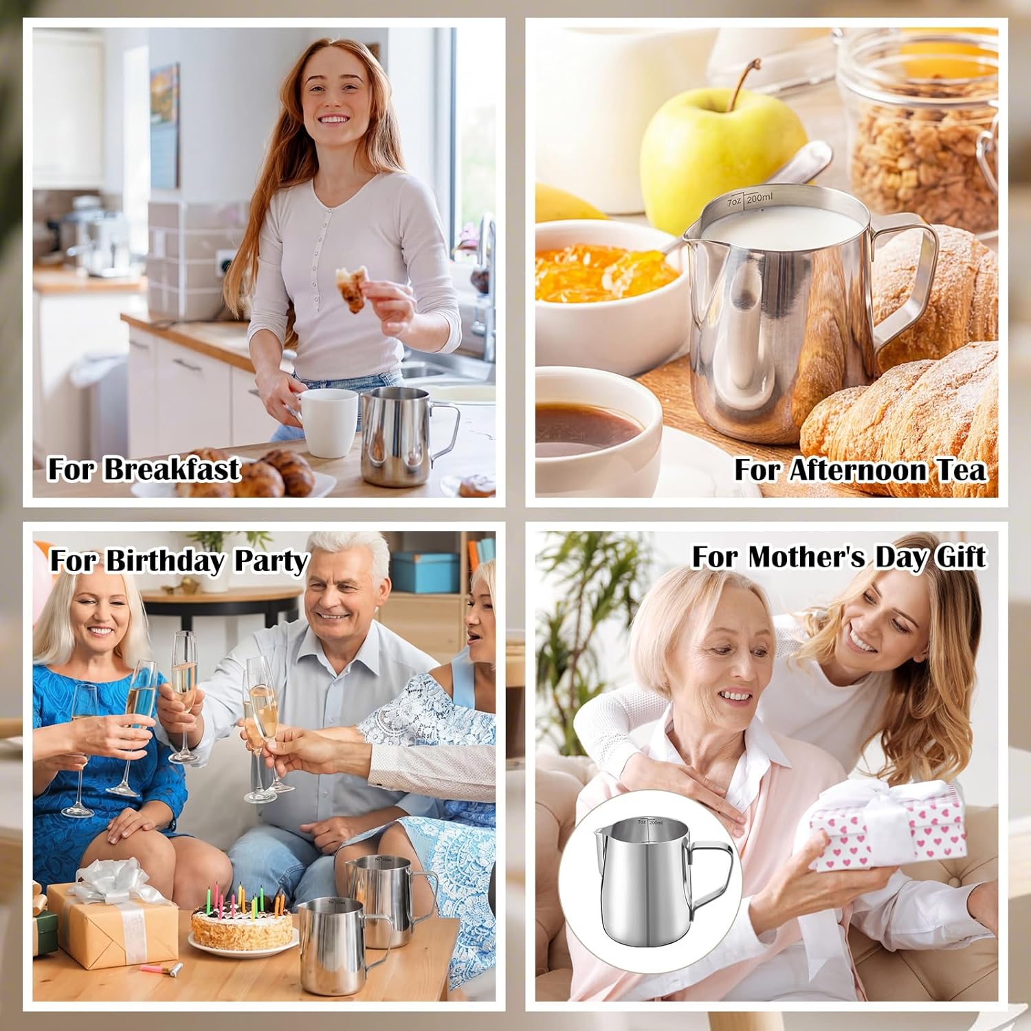 Features: This stainless steel latte art pitcher features a double V-shaped spout with a thickened precision spout design, enabling users to achieve more precise control over the flow of coffee or milk. It is especially suitable for creating intricate latte art patterns. Professional baristas can use this pitcher to accurately manage the flow of frothed milk, crafting complex latte art designs. In coffee shops, family restaurants, or outdoor gatherings, this pitcher serves as an ideal tool for practicing and showcasing latte art skills. Specifications: Specifications: Material: 304 stainless steel Capacity: 200ml/7oz Color: bright silver Package includes: 12 X Stainless steel pitchers Notes: Manual measurement, please allow slight errors on size. The color may exist a slight difference due to different screen displays