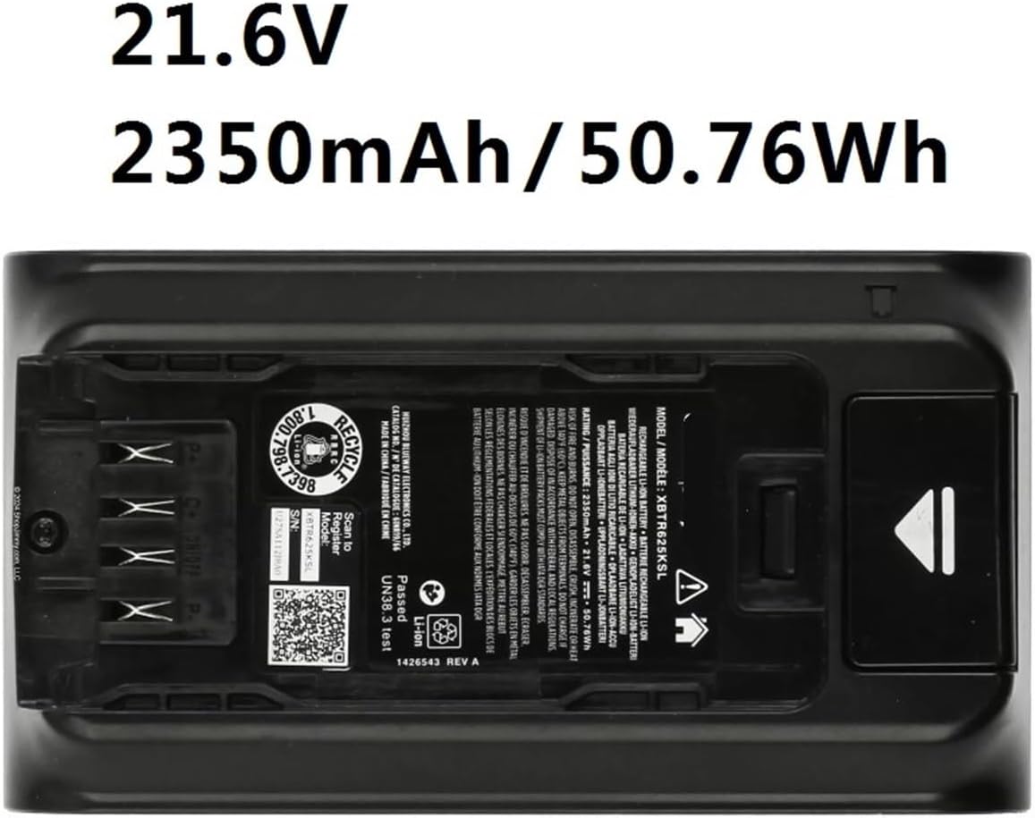 Note: Please double-check that it is suitable for your vacuum cleaner before purchasingCompatible For: XBTR625KSLVolts: 21.6V Type: Li-ionColor: BlackCapacity: 2350mAh/50.76Wh Package Contents:1 x Li-ion batteryOnly the above package contents are included, and no other products are included.Note: Depending on the light and display, the color of the product in the picture may be slightly different from the actual product. The permissible measurement error is +/-1-3cm