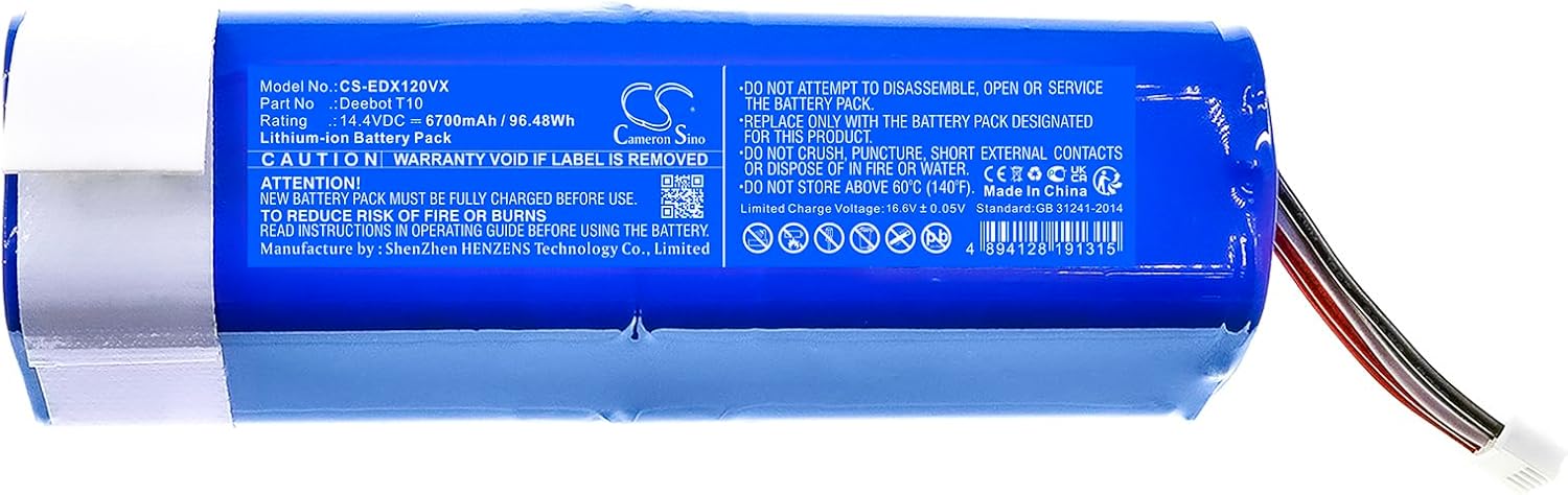 ❤Cameron SinoCameron Sino is a brand focusing on sell battery, we aim at supplying high-quality professional battery products.❤Fit Modelr for:Ecovacs Deebot T10, Deebot T10 Plus, Deebot T10 Turbo, Deebot X1 Omni, Deebot X1 Plus, Deebot X1 Turbo, DEX11, D-X1OM, D-X1PL❤Part Number for:Ecovacs 201-2115-1959❤Notice Before Purchase- Be carefully check the model number of your device and the part number of your original Battery to see if this Battery is compatible with your device.- A new battery will achieve its best performance after 2 or 3 complete cycles of charge & discharge.- When you install it, be sure the connector has been properly connected to your device.- Do not use low quality third-party adapter charger to charge your device, that will shorten the battery's life.Caution:1.Don't disassemble2.Don't dispose of in fire or water3.Don't store above 60 ℃(140℉)❤Contact usIf you have any questions or any issues when using our product, please send us a message, we will reply you as soon as possible.