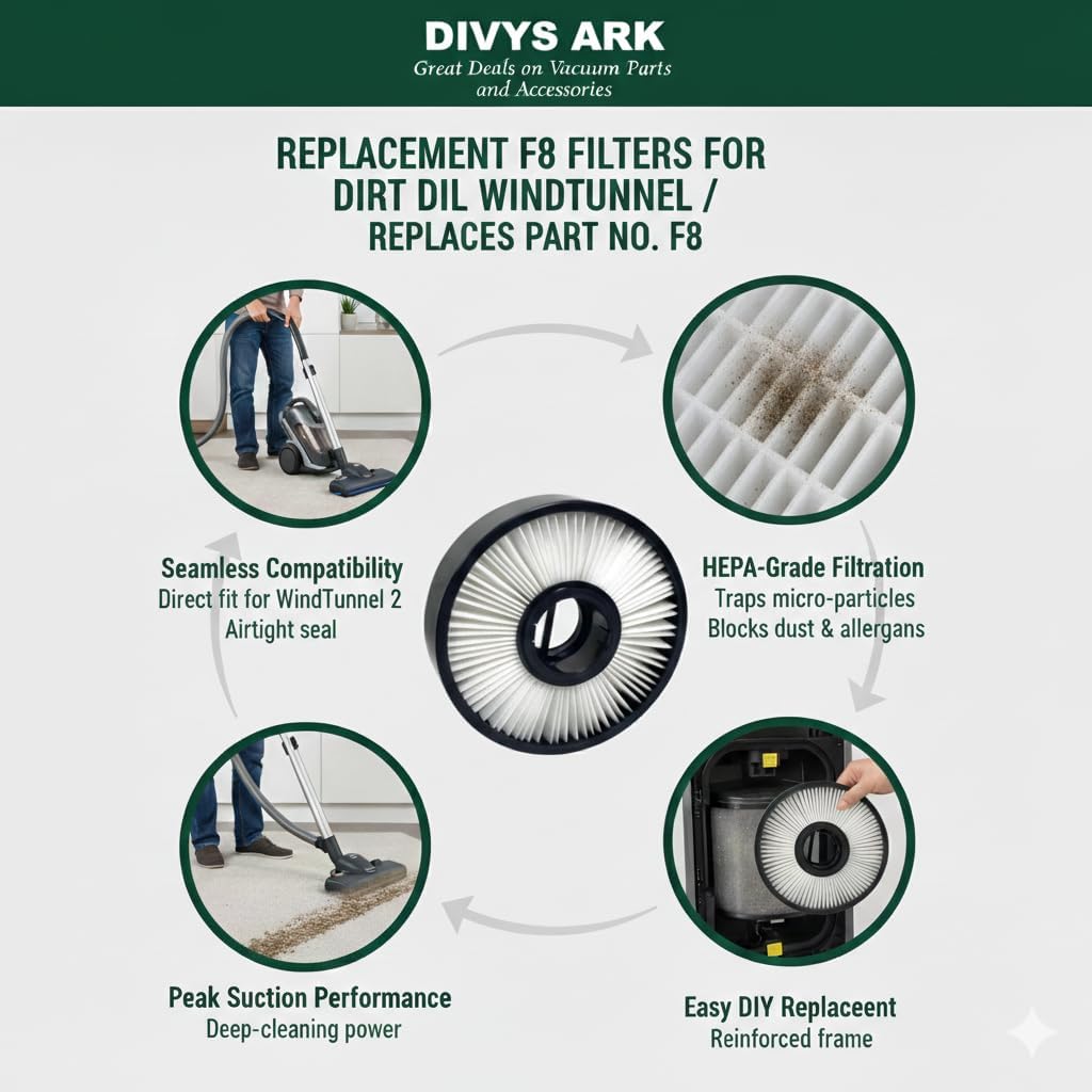 This replacement Dirt Devil F8 Type filter is designed to restore suction power and filtration efficiency in compatible Dirt Devil vacuum cleaners. Manufactured with high-quality filter media, it captures fine dust, dirt, and common household debris while allowing proper airflow through the vacuum system.