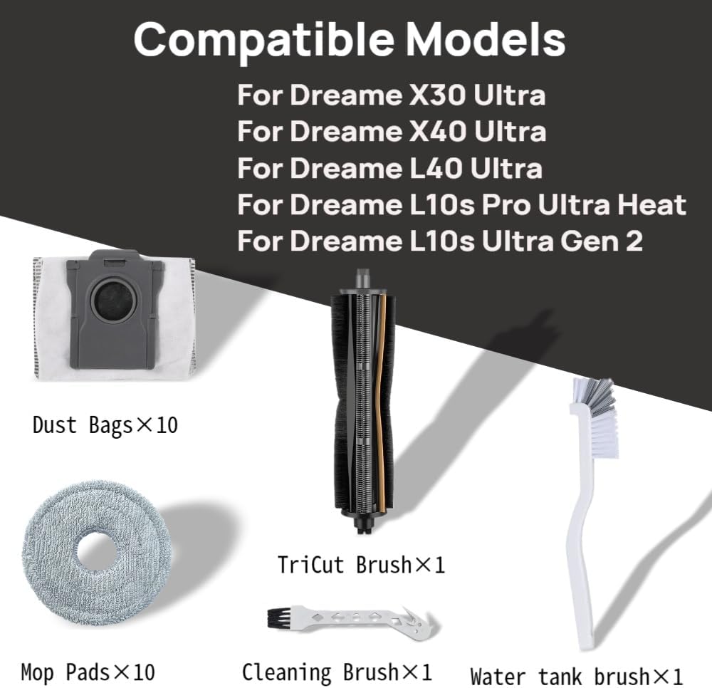(23 Pcs) TTriCut Brush Replacement Kit for Dreame X40 Ultra, X30 Ultra, L10s Pro Ultra Heat /L10s Ultra Gen 2, L40 Ultra ,Mova E30 Ultra Vacuum Cleaner, 23-Pack Accessories with Main Brush, Mop Pads, Dust Bags,Water tank cleaning brush