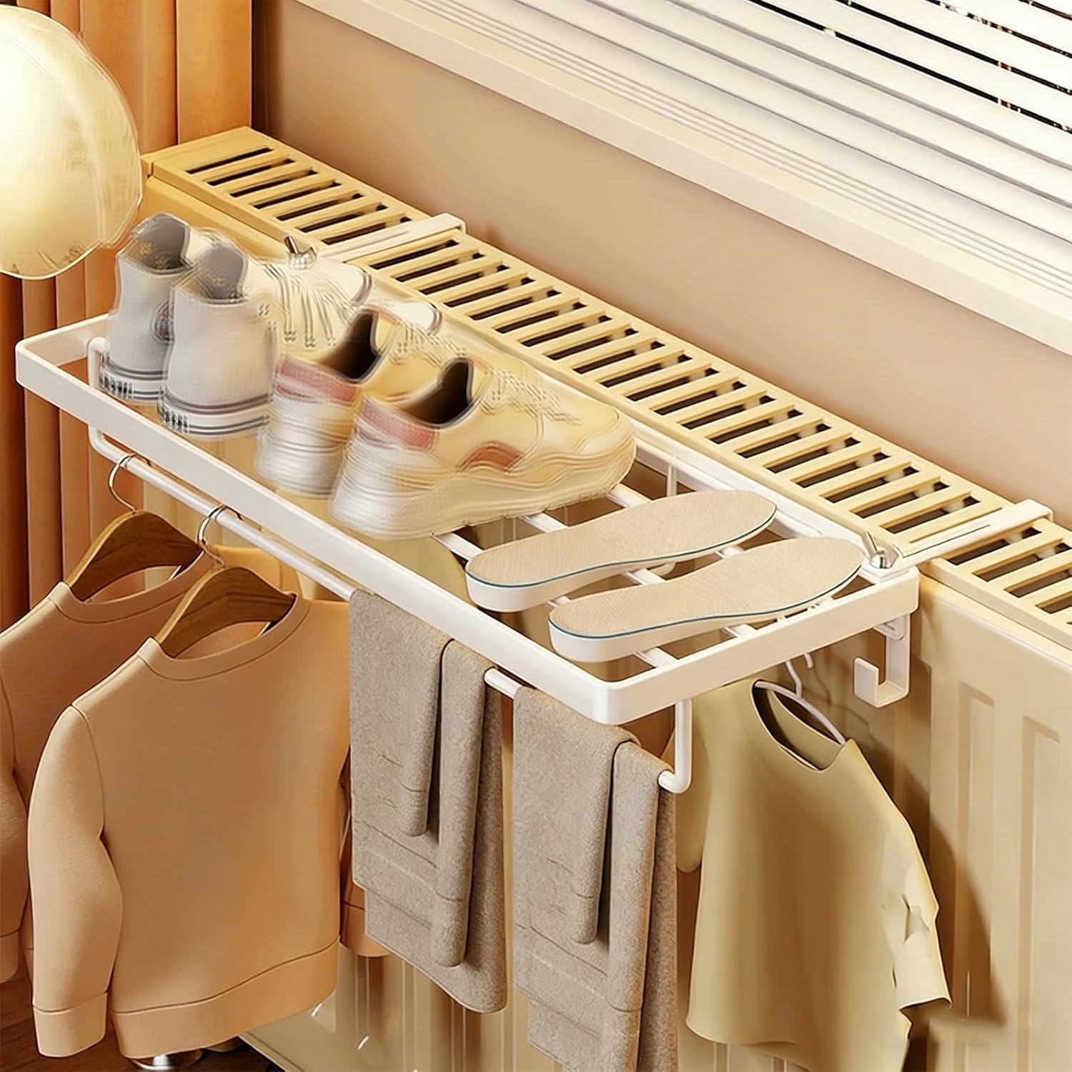 This Radiator Shelf is an innovative and adjustable hanging rack designed specifically for radiator pipes, seamlessly combining functionality and style. Crafted from high-quality wrought iron, available in classic Black and White, this versatile shelf integrates the features of radiator shelves, floating radiator shelves, and radiator racks, making it an essential addition to your home. With thoughtful design elements, it optimizes your drying space while meeting various needs, all without the hassle of drilling.The adjustable hook spacing and length ensure a universal fit for both thin and thick radiators, while the spacious surface allows for effortless drying. Engineered for durability, this shelf boasts a strong load-bearing capacity and maintains its shape, making it perfect for drying bedroom clothes, shoes, and socks. It not only keeps your clothes warm for early morning use but also helps eliminate clutter, adding a touch of sophistication to your living space.Specifications:- Product Name: Radiator Shelf - Material: Wrought Iron- Color Options: Black, White- Dimensions: 35x20x12cm, 55x20x12cmApplication Scenarios:1. Bedroom: Ideal for drying pajamas and socks, keeping your clothing warm for a cozy morning.2. Living Room: A stylish radiator rack for drying coats and scarves while enhancing the room's elegance and organization.3. Dormitory: The no-drill design is perfect for compact spaces, making it easy to dry clothes and socks.4. Apartment: As a floating radiator shelf, it fits various radiator sizes and suits small layouts effortlessly.5. Entryway: Conveniently dry shoes and hang accessories, ensuring they're warm and ready for your morning routine.6. Guest Room: Provides extra drying and storage space for guests, combining practicality with a refined aesthetic.7. Children’s Room: Safe and sturdy, perfect for drying kids’ clothes without safety concerns.