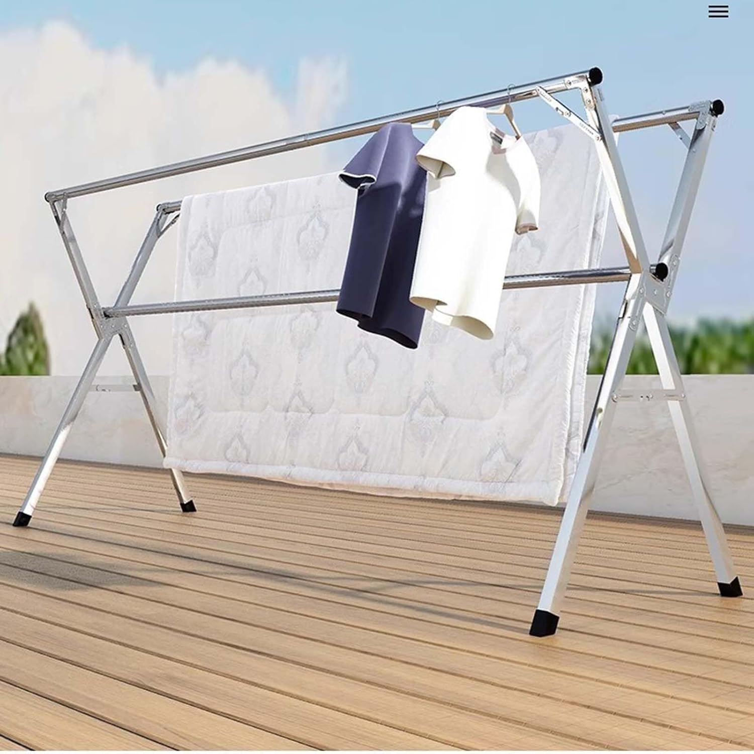 Upgrade your laundry routine with this Heavy Duty Stainless Steel Clothes Drying Rack, designed for reliable performance both indoors and outdoors. Crafted from stainless steel, this rust-proof and wind-resistant drying rack withstands the elements, making it ideal for balconies, patios, gardens, or laundry rooms.The innovative X-type design, reinforced with an anti-shake bar and thick non-slip bottom corners, provides exceptional stability even in windy conditions. Supporting up to 75kg (165lbs), this rack offers ample space for drying bulky items such as blankets, sheets, sweaters, and everyday clothing. Two extendable rods and a central pole allow you to customize drying space to your needs, promoting optimal air circulation and faster drying times.Setup is quick and effortless—simply unfold and start using it immediately. When not in use, the rack folds down compactly to save space, making it perfect for small homes or apartments. The included 10 windproof hooks secure your clothes firmly, preventing slipping or loss due to wind.Make an , choice with this versatile and durable clothes drying rack—perfect for any household looking to combine convenience, efficiency, and long-lasting quality.